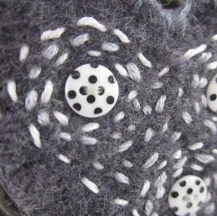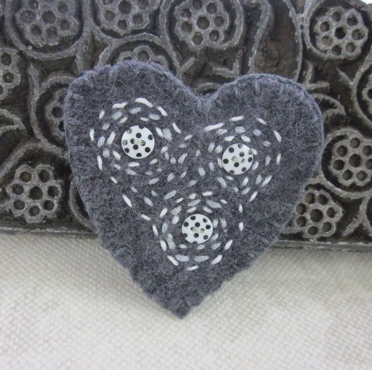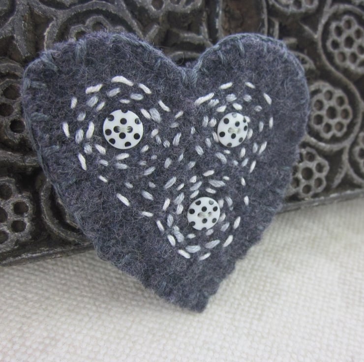 A cute heart shaped brooch made from knitted, felted dark grey wool. Embellished with tiny polkadot buttons embroidered with light grey and white spirals and circles