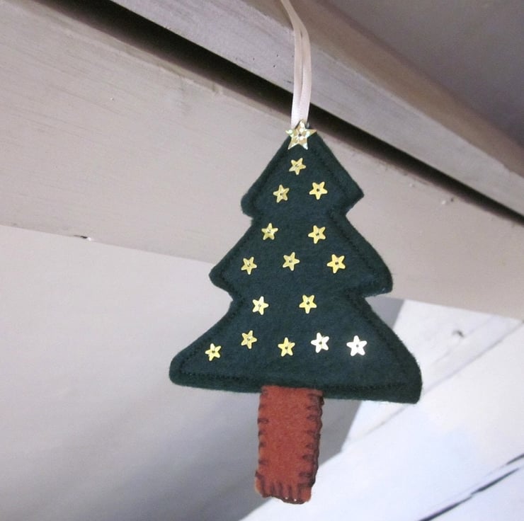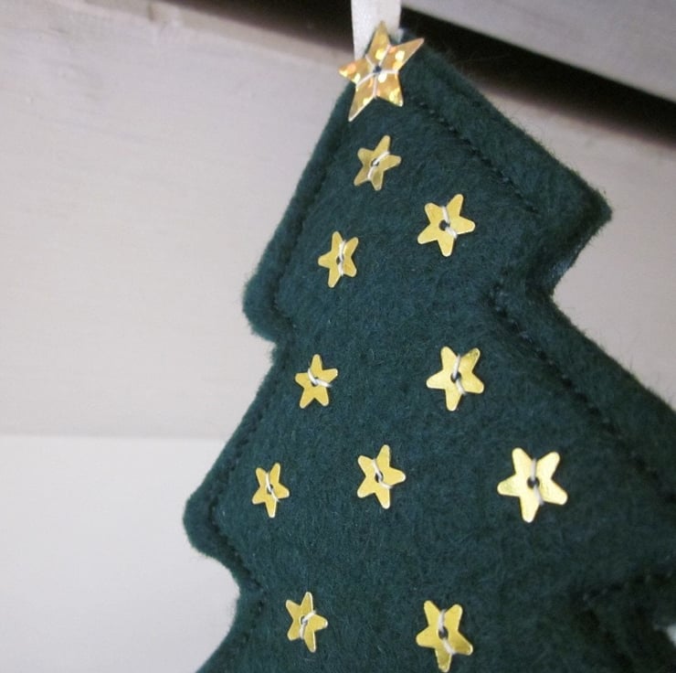 Made from dark green felt with a small gold sequins, this will sparkle as it twists from it's ivory ribbon hanger.