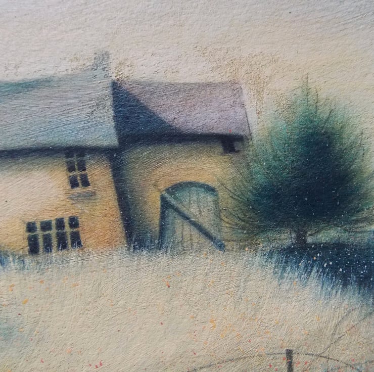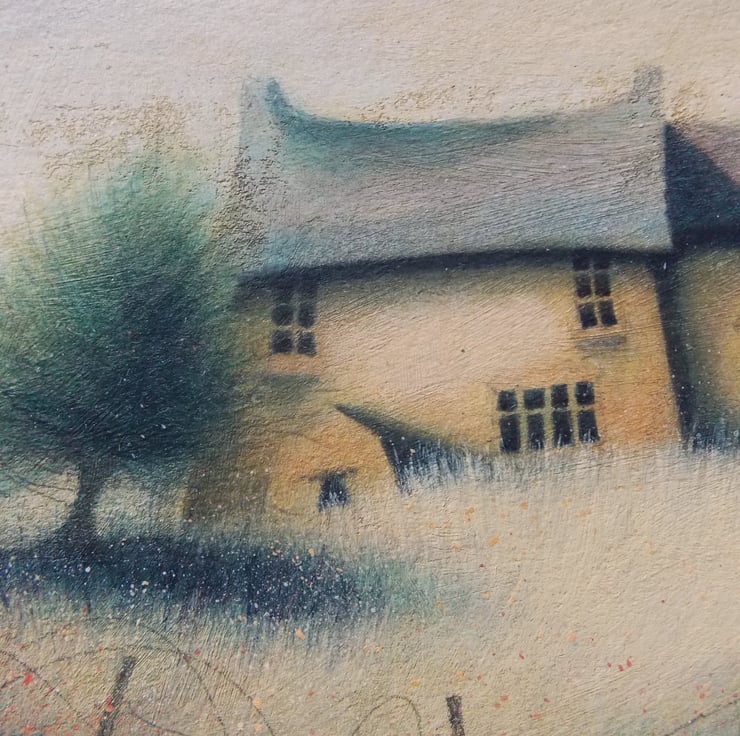 This painting shows my love of old stone dwellings, trees and the atmosphere dark clouds bring to the landscape.