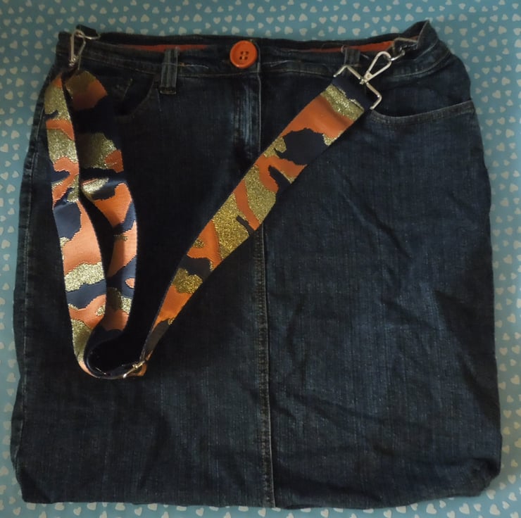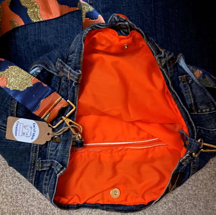 Upcycled Denim skirt made into a fun bag, this has a orange lining with internal zip pocket and magnetic closure.