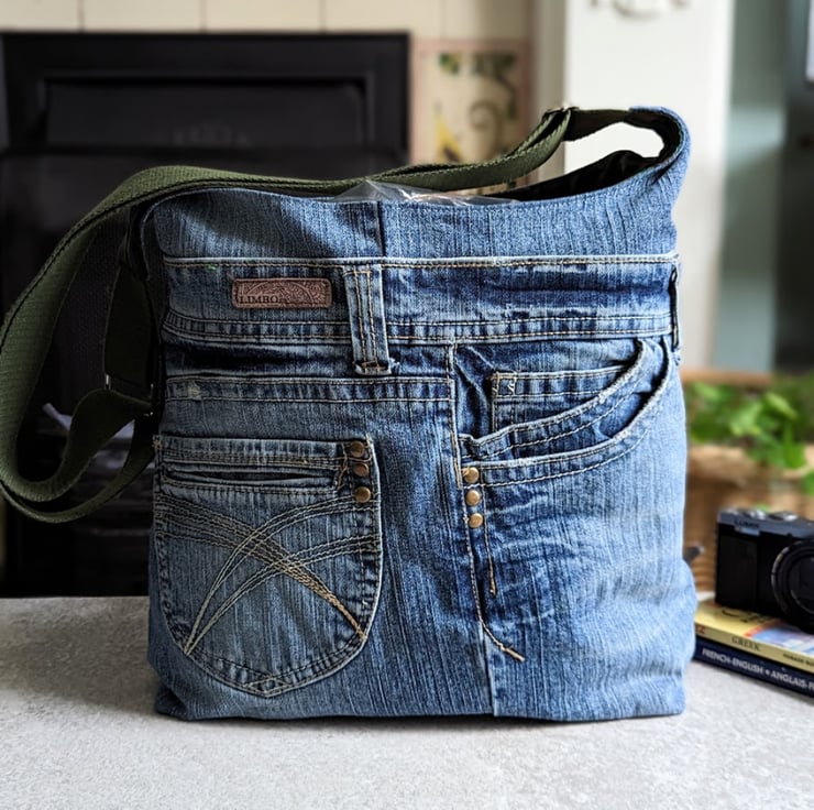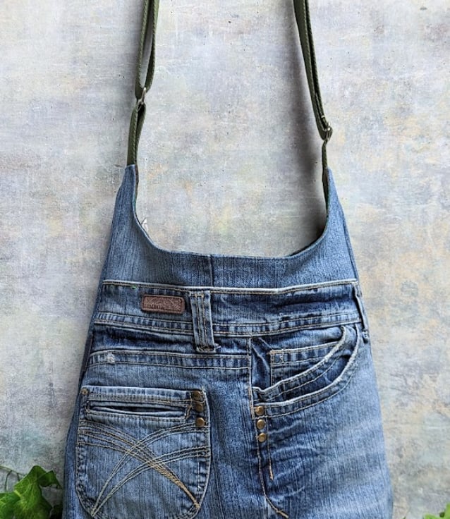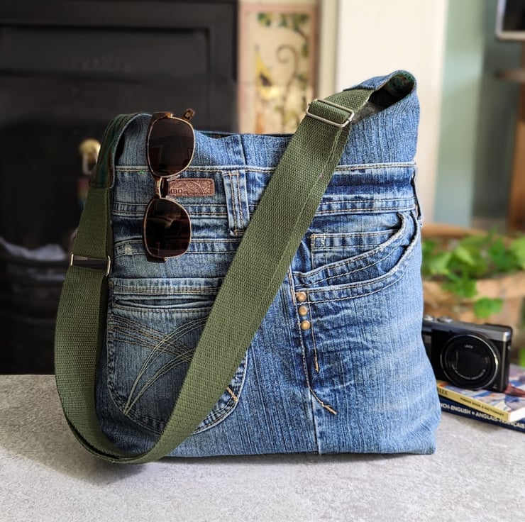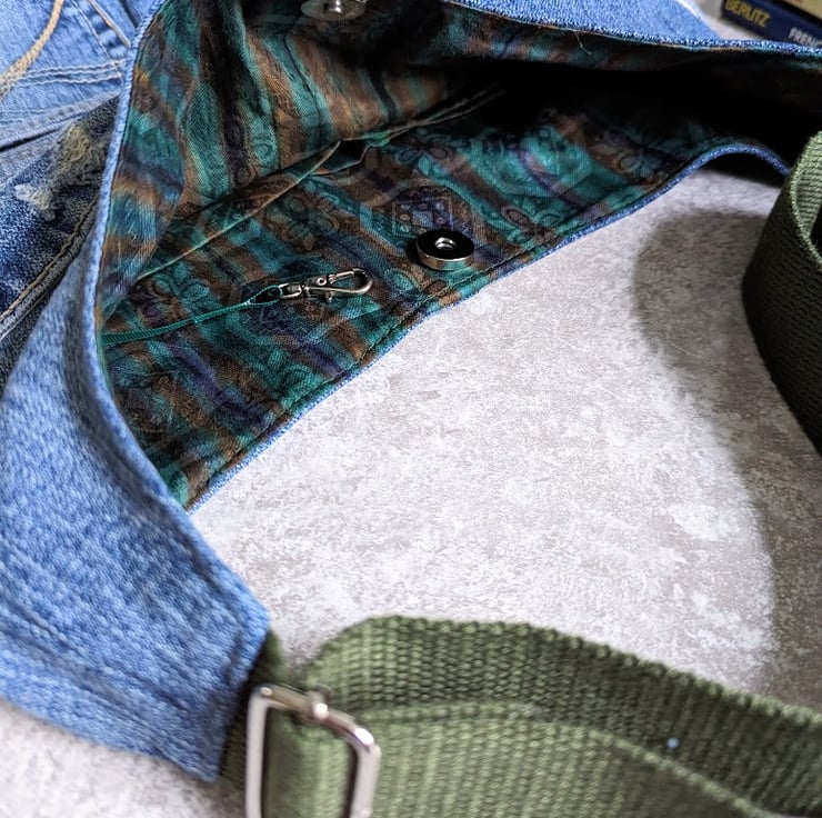 This repurposed denim shoulder bucket bag has been handmade using repurposed worn denim jeans and lined with a green patterned lining. An olive green adjustable shoulder or cross body strap strap fits comfortably over the shoulder and perfectly compliment the lining. Choose length of strap (shoulder or cross body) from drop down menu.