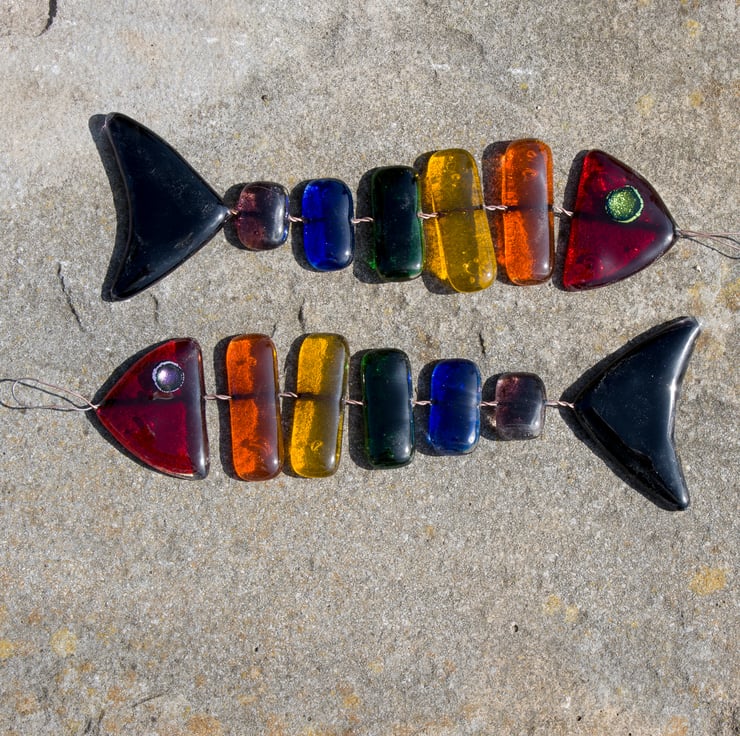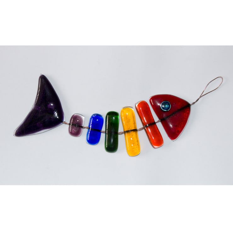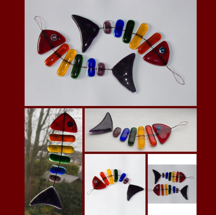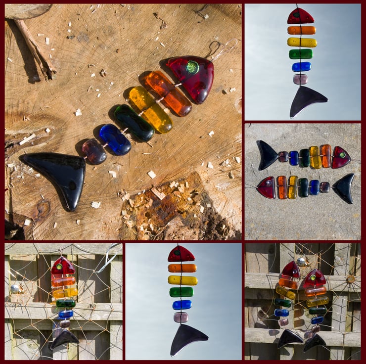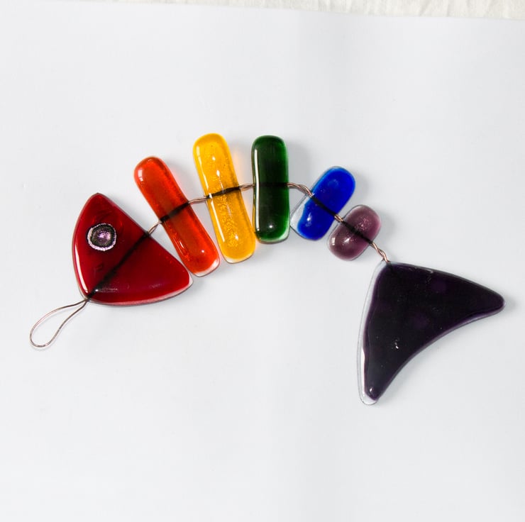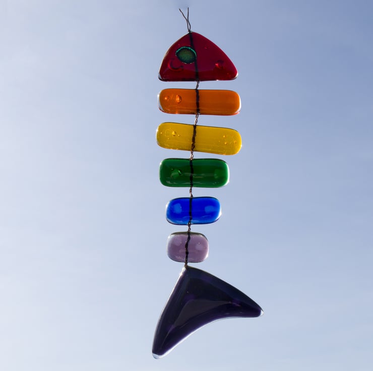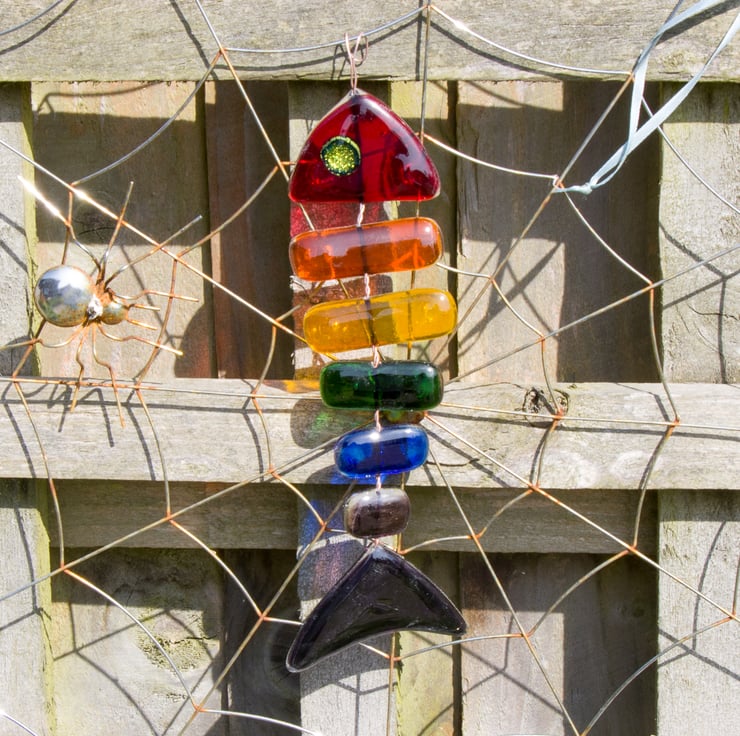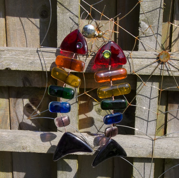 We think this is a Rainbow Trout, but we're not experts in fish. She has a red head, 5 segments to her body (orange, yellow, green, blue, and indigo), a violet tail and a twisted copper wire spine. She can hang in your window, catching the sunshine and sparkling, or she can hang outside in the garden.