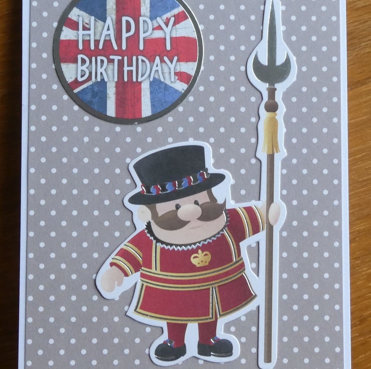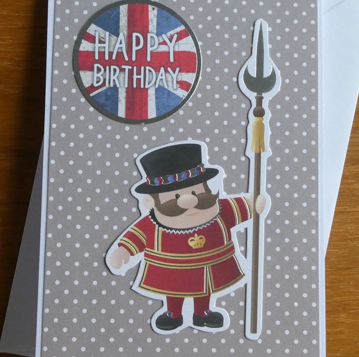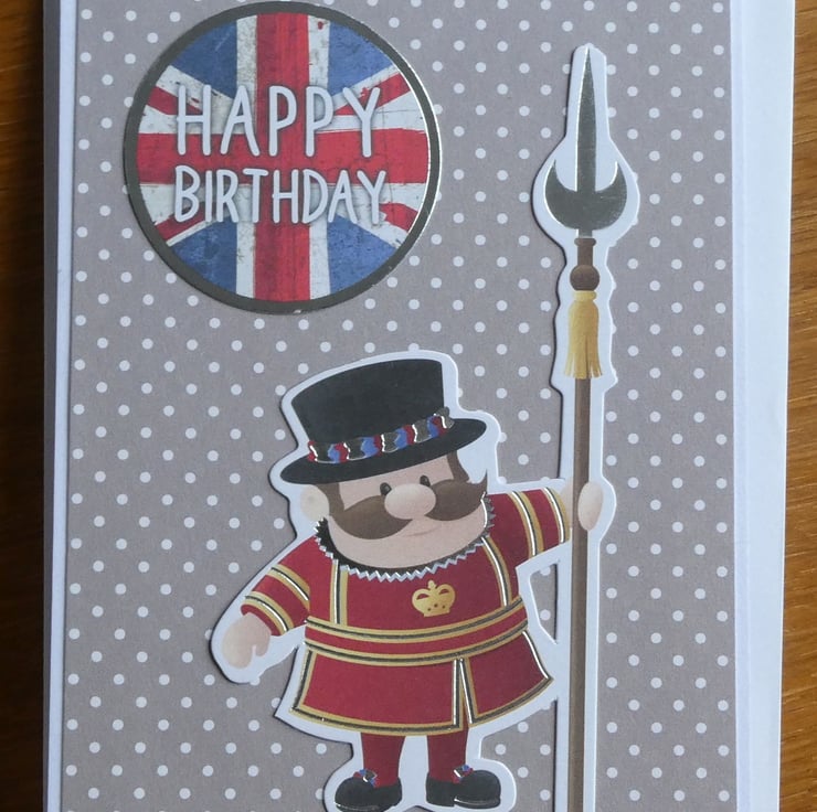 This birthday card with a printed die cut image of a Yeoman Warder (Beefeater) would be great to send to a child with an interest in British or Royal History or who has recently been to visit London or the Tower of London.