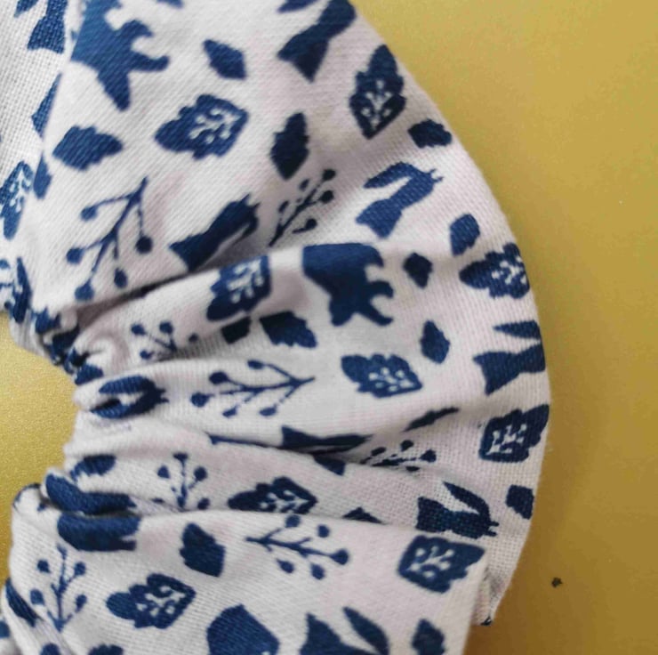 A delicately patterned scrunchie with tiny blue pictures. 100% handsewn.