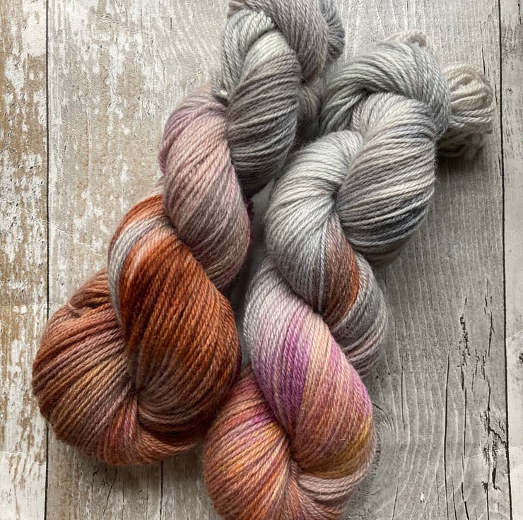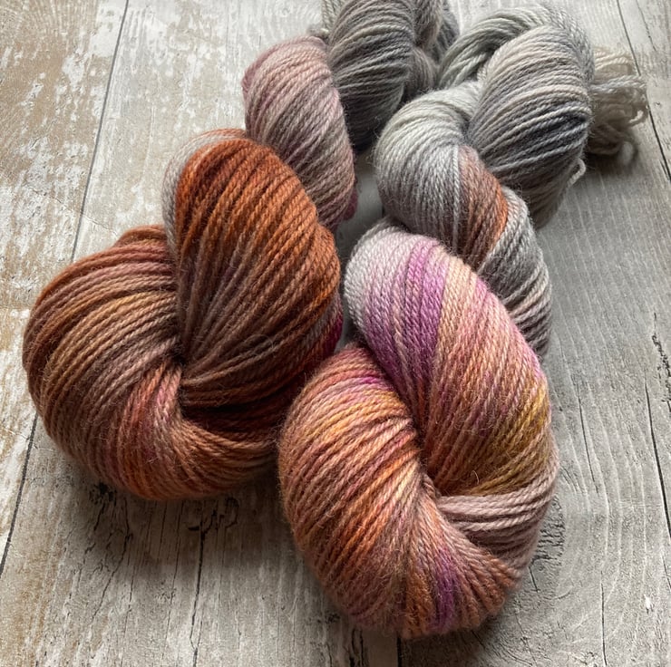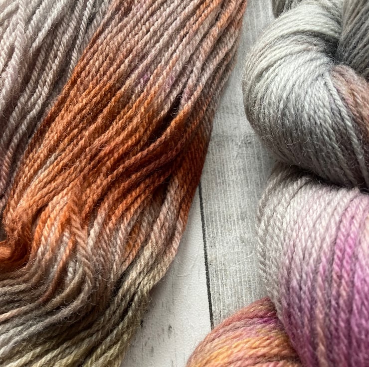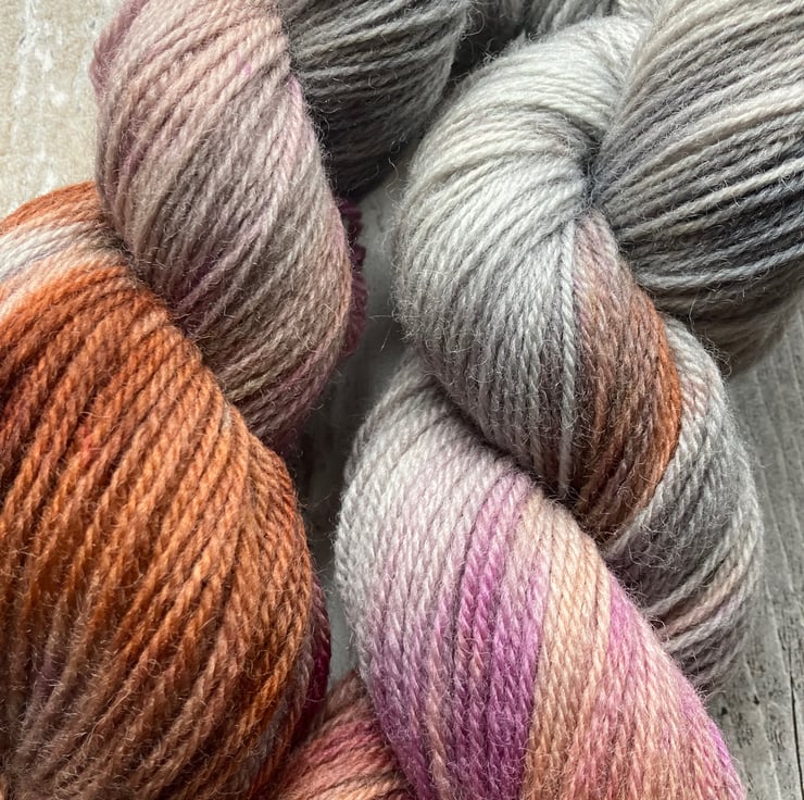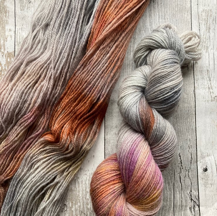 Skein of hand dyed Kent Romney yarn as shown.