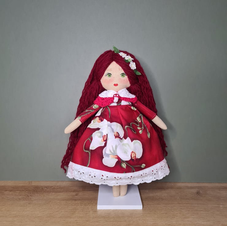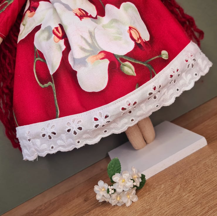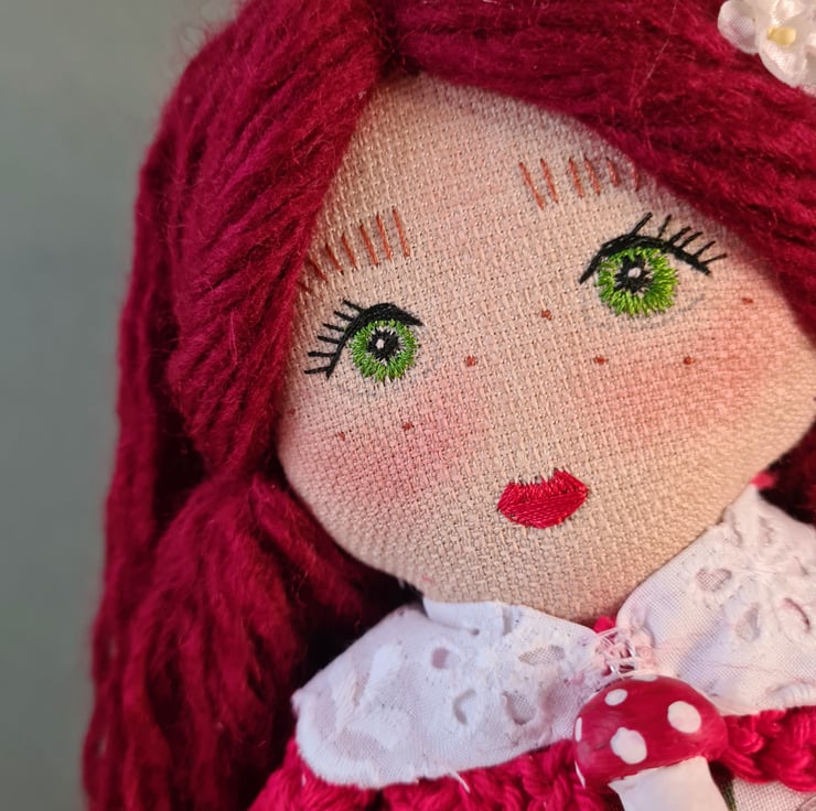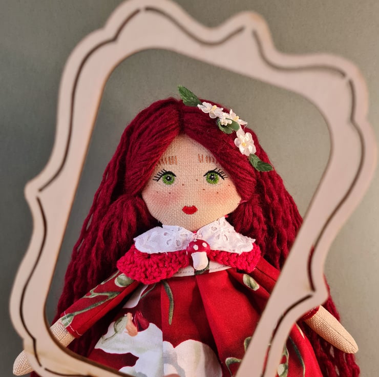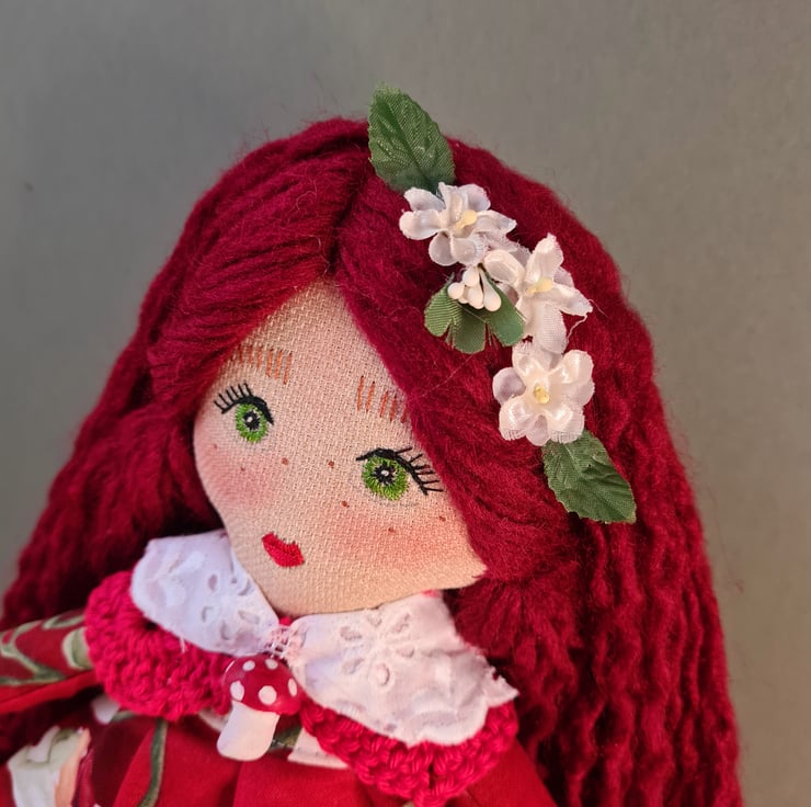 'Clarissa' is a vibrant heirloom doll with lots of little details. Her gorgeous wavy red hair ties in perfectly with he beautiful dress colours. Along with her little crocheted collar & lace trim which also matches her hem lace. Her dress is made from a lovely high quality cotton by the designer 'Cedar West' called Royal Orcards which is so eye catching. One more little detail will be her sweet little toadstool round her collar, she found it while foraging in the woods (clay made and painted by me)