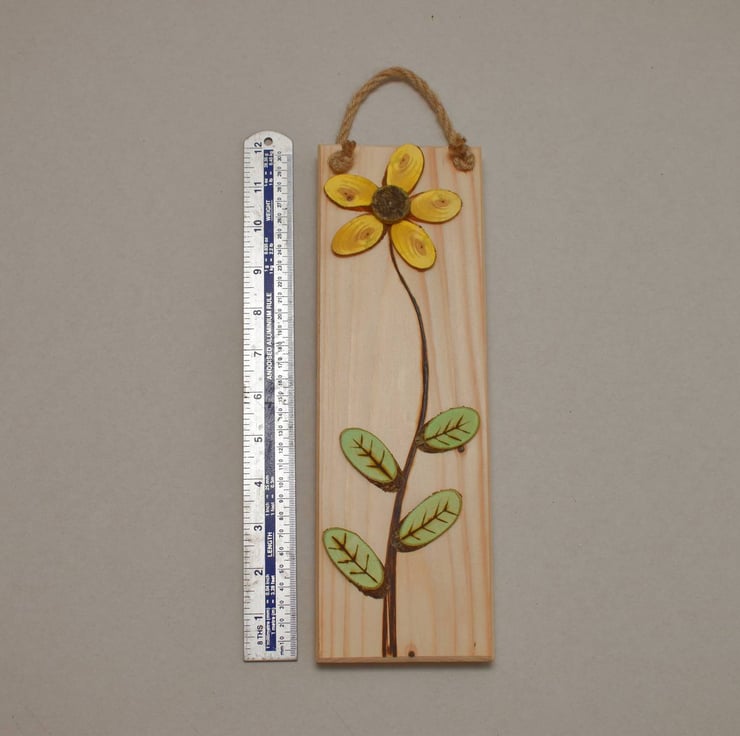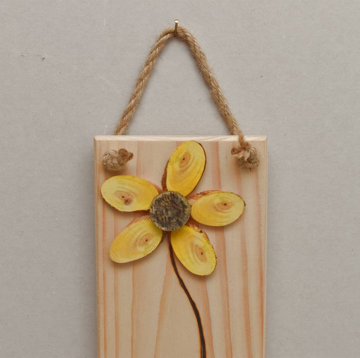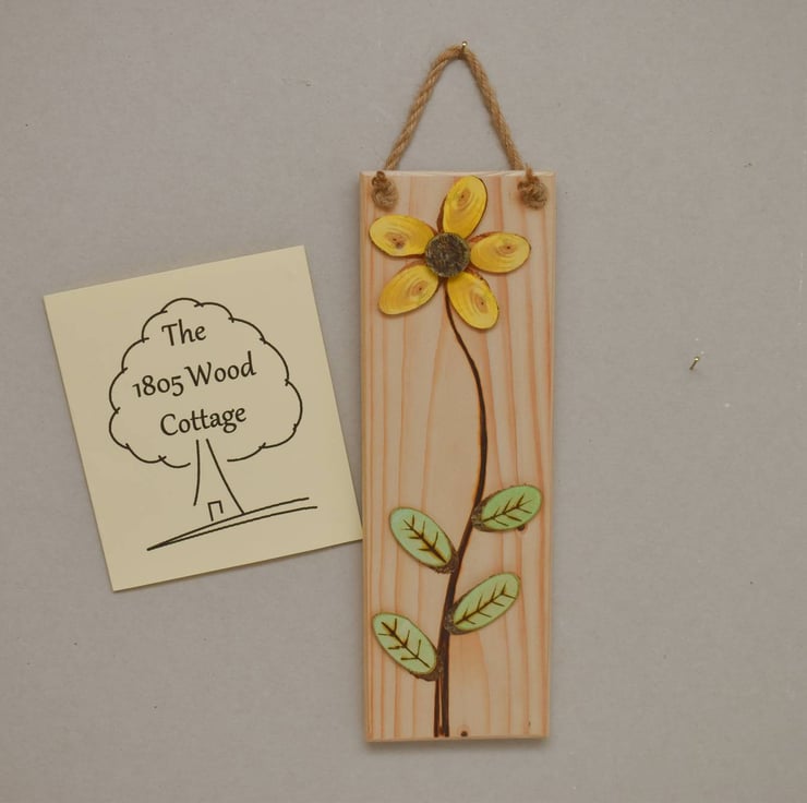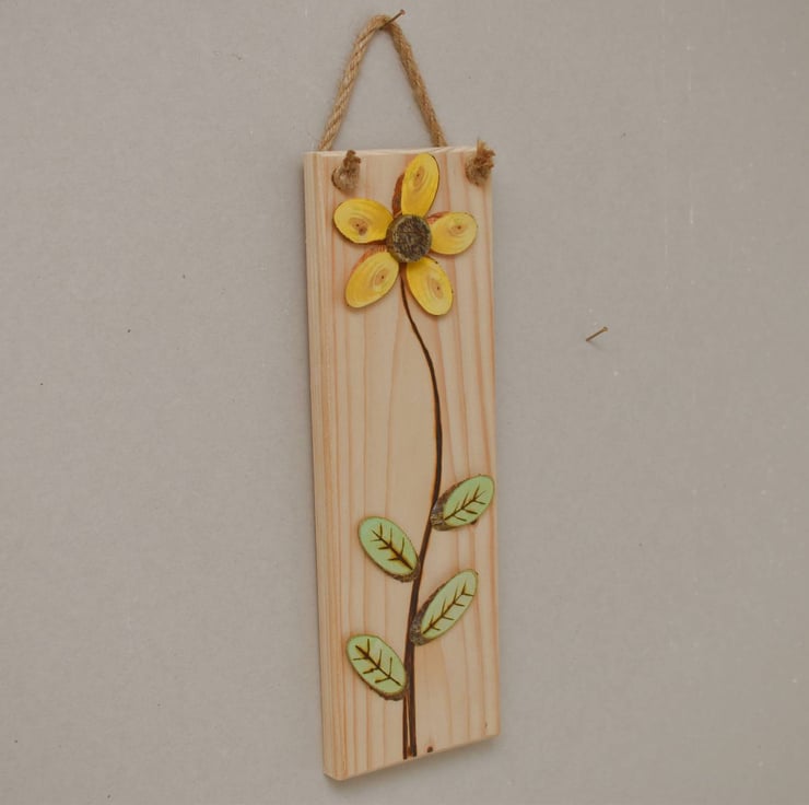 The picture uses pyrography to create the flower stem on the reclaimed wood base board then stained wood slices to make the flower and leaves, additional detail is then added to the leaves again using pyrography.