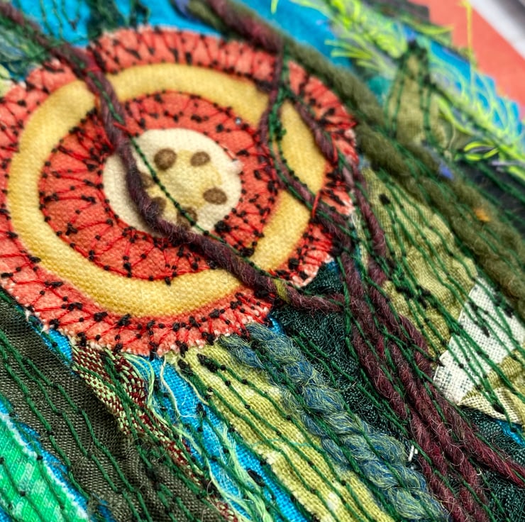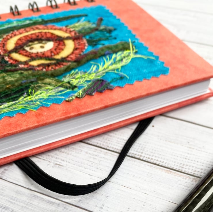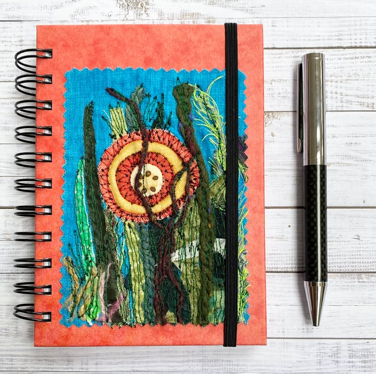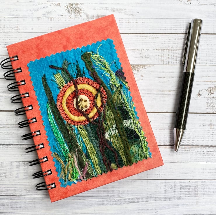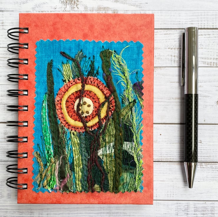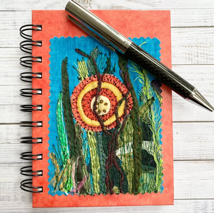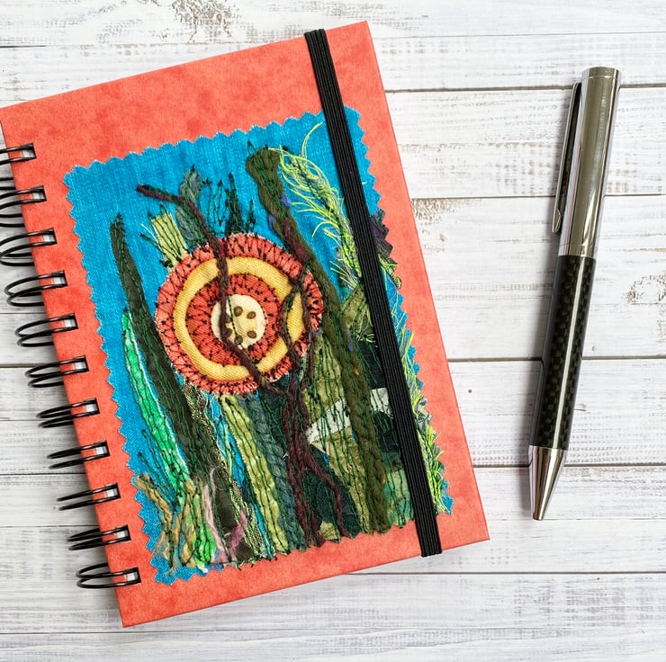 This sturdy A6 hardback spiral bound notebook has been enhanced with an embroidered flower and garden plants. Its made from up-cycled and recycled fabrics with free motion embroidery. It’s ideal for making notes, lists or doodling, and will neatly fit a handbag or pocket. It measures 155 x 120mm, contains 192 pages at 80gsm which are feint lined, and it has elastic to keep it compact. The artwork measures 9 x 12cm.