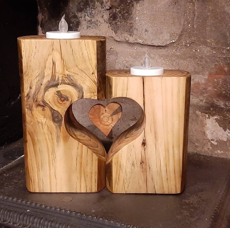 Each holder is hand crafted and the two halves are dowelled and glued together to create a heart shaped cutout which in turn features it's own 'floating' heart.