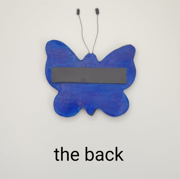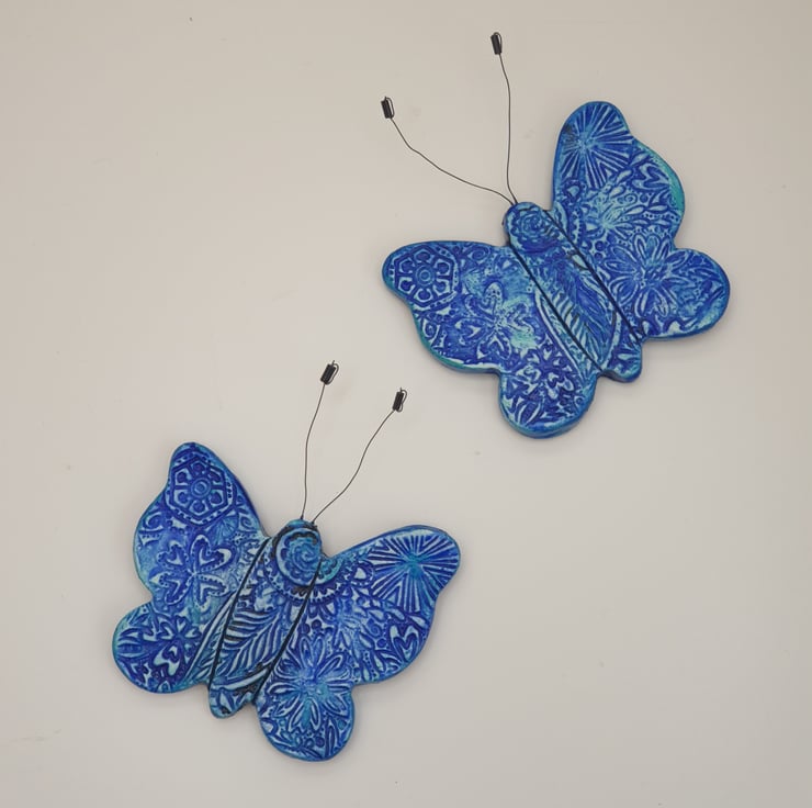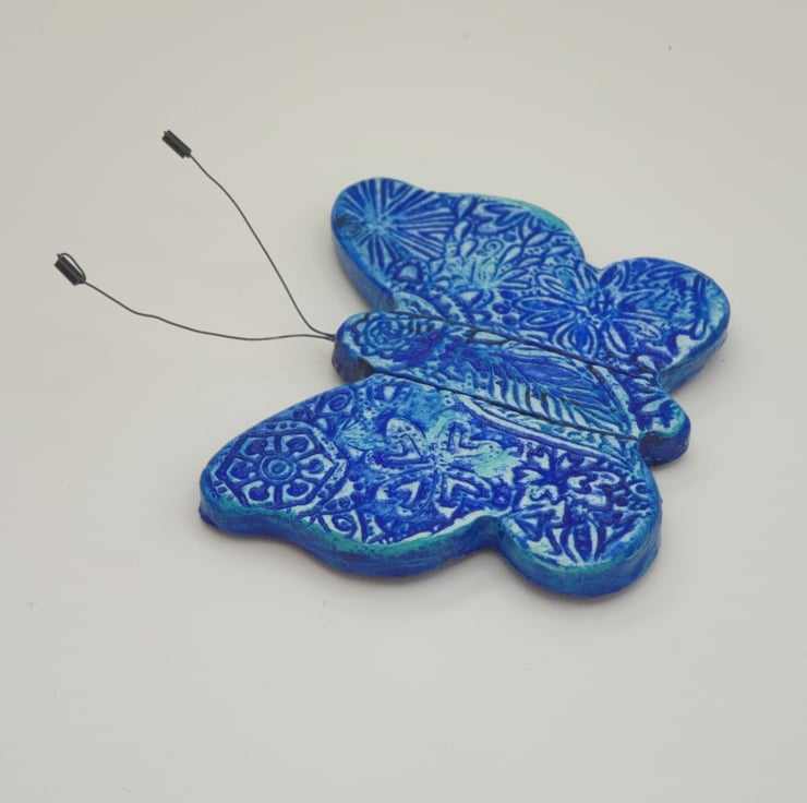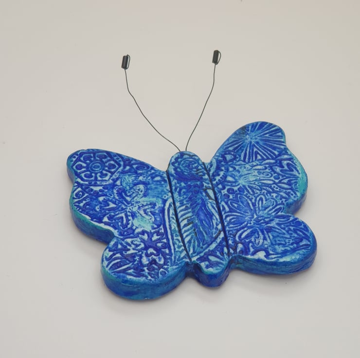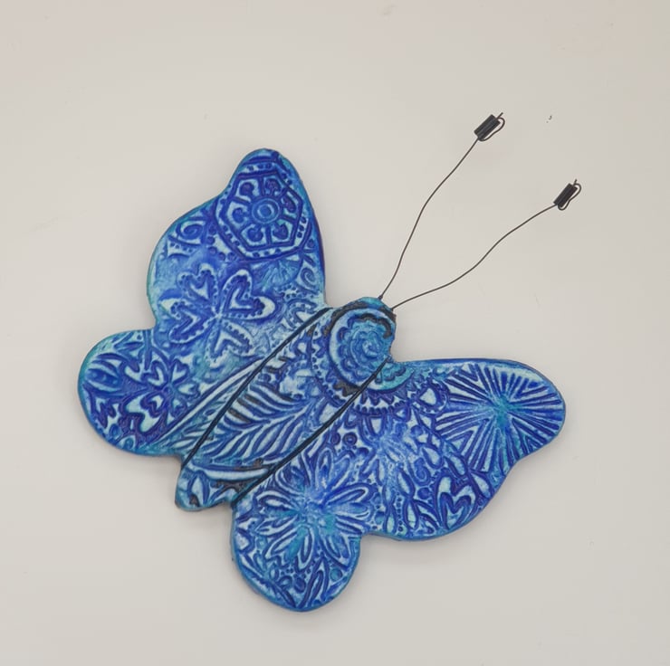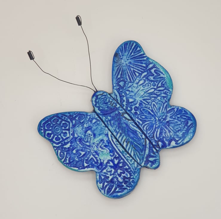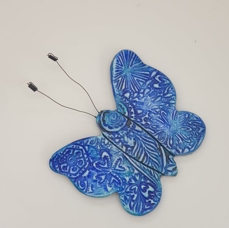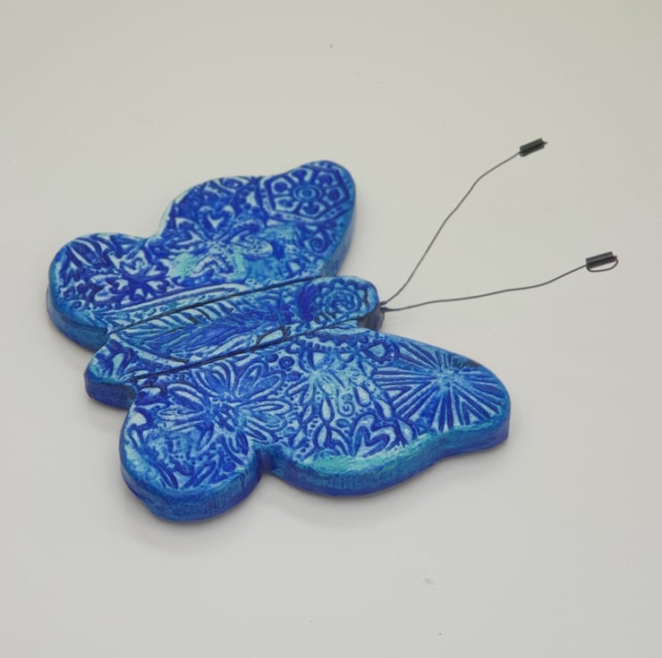 Beautiful clay butterfly fridge magnet which has been lovingly created from air dry clay, embossed on the front with a floral pattern, painted with mixed shades of blue acrylics and finished with a coat of varnish for protection. The butterfly's antennae have been made from jewellery wire and beads. A strip magnet has then been attached to the reverse.
