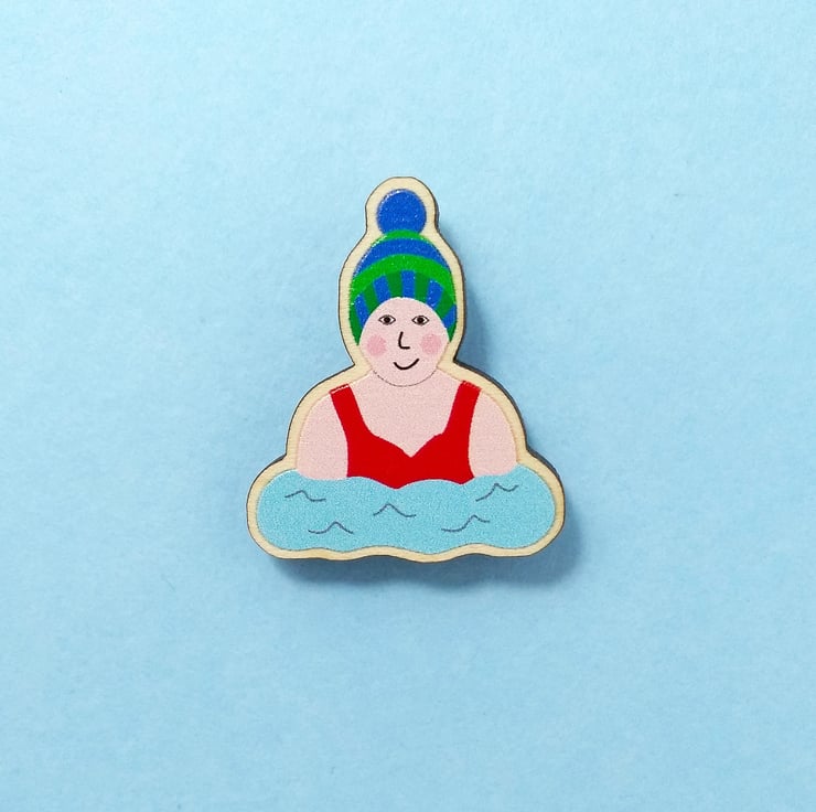 The swimmer with bobble hat measures approx 30mm across and 34mm from top to bottom, thickness of the badge is 4mm. The pin on the back is a metal butterfly clutch pin.