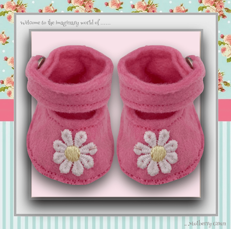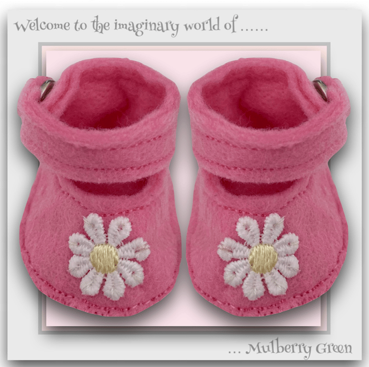A lovely little pair of rose pink shoes, decorated with little daisies, to fit the Mulberry Green characters. They fasten with a little popper underneath a button.