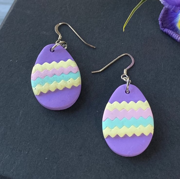Easter egg patterned polymer clay earrings on sterling silver ear wires. Handmade egg shaped earrings in soft pastel colours featuring zig zag stripes of yellow, pink and mint green. The earrings have a matte finish.