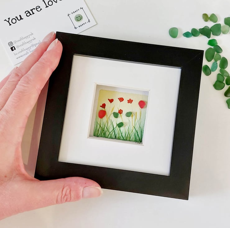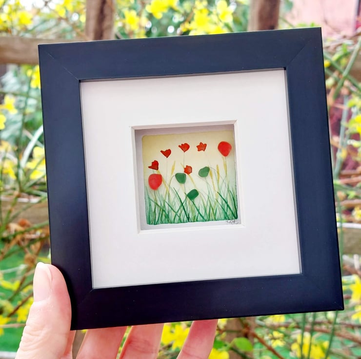 The time of year when the poppies come out is a beautiful one. Flower fields are stunning and there is one near to me that I always stop to photograph when I'm passing, I'm the same with lavender and blossom trees, I can't help myself, I feel inspired to paint it. These sea glass pieces have been painted on the reverse so that the vibrant red shines through the natural frosting to stunning effect.