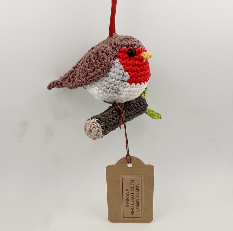 Thus friendly robin is all set to deliver a message on your behalf. He is crocheted in cotton from a gorgeous pattern by Stella at stellasyarnuniverse and filled with polyester stuffing. He has black safety eyes and a narrow ribbon hanging loop. He is perched on a branch made from a sturdy cardboard tube covered in crochet. The tag reads, Robins appear when loved ones are near, although I am very happy to exchange this tag for one with wording of your choice.