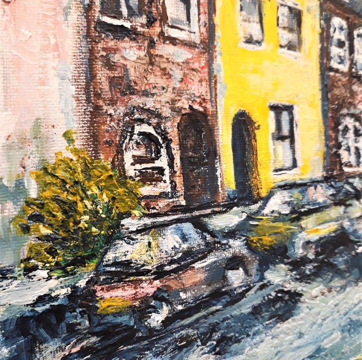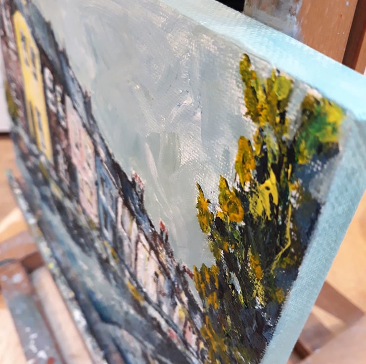 This painting is unframed, rectangular and hangs horizontally. Approximately A4 size, it can be hung without a frame if desired as the sides are painted in a lovely colour matching the sky (pale blue/green). A perfect gift for a lover of unique art, this is the original painting, not a print.