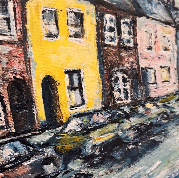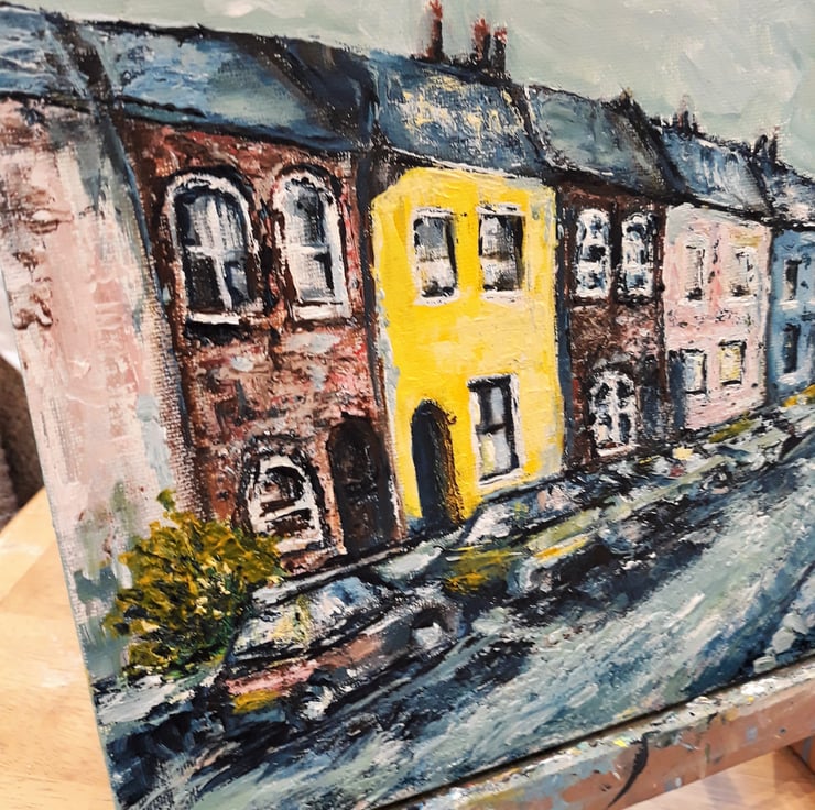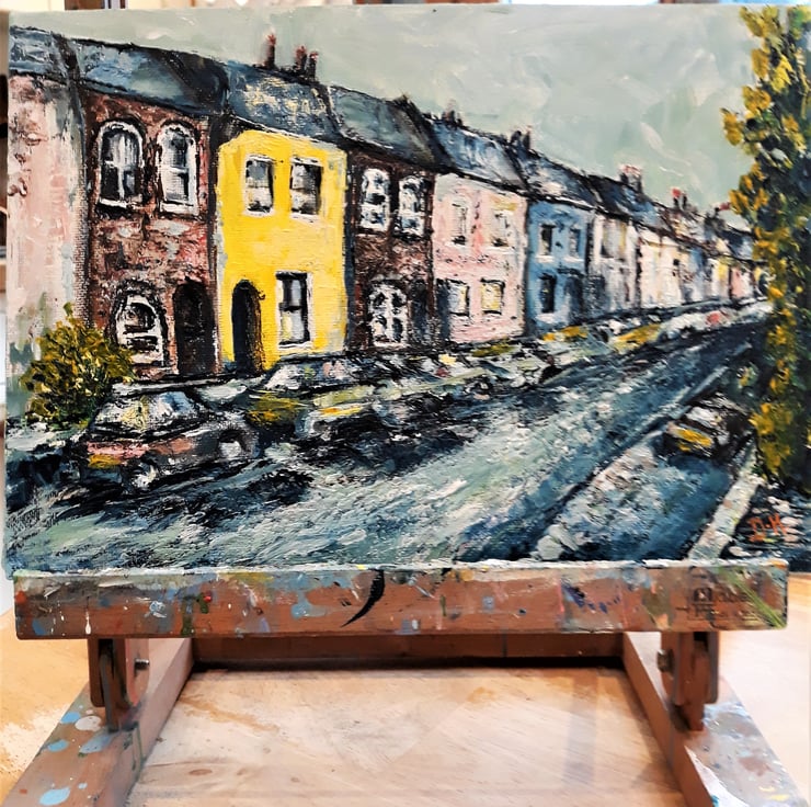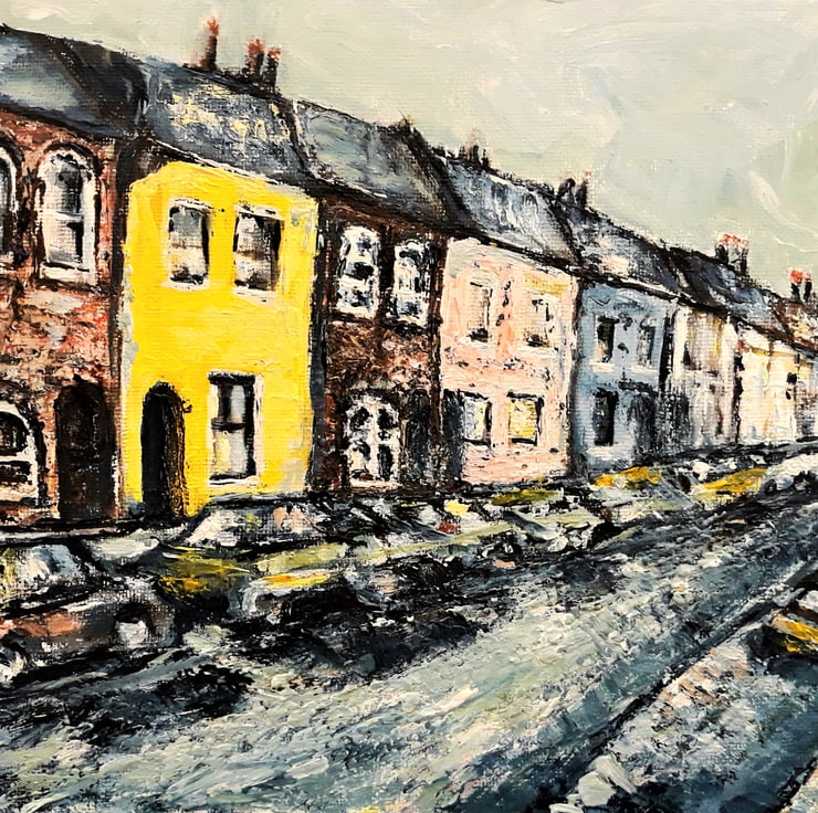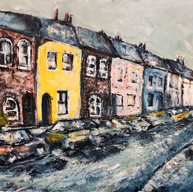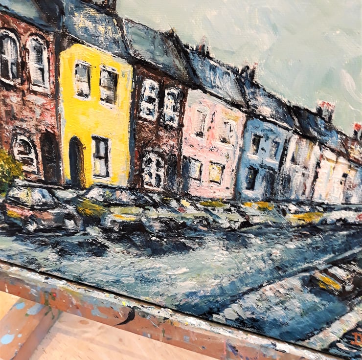 'Streatham Streets' is an original painting in acrylics on stretched canvas. It is texrtured and painted in bold colours featuring a street in Streatham, South London. There is a row of small terraced houses in varying colours and lots of parked cars, the scene is contrasted by the light coloured sky.