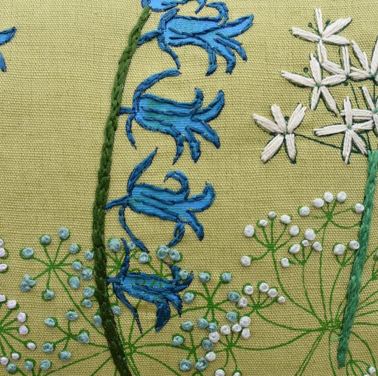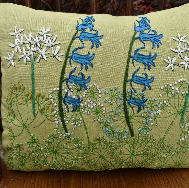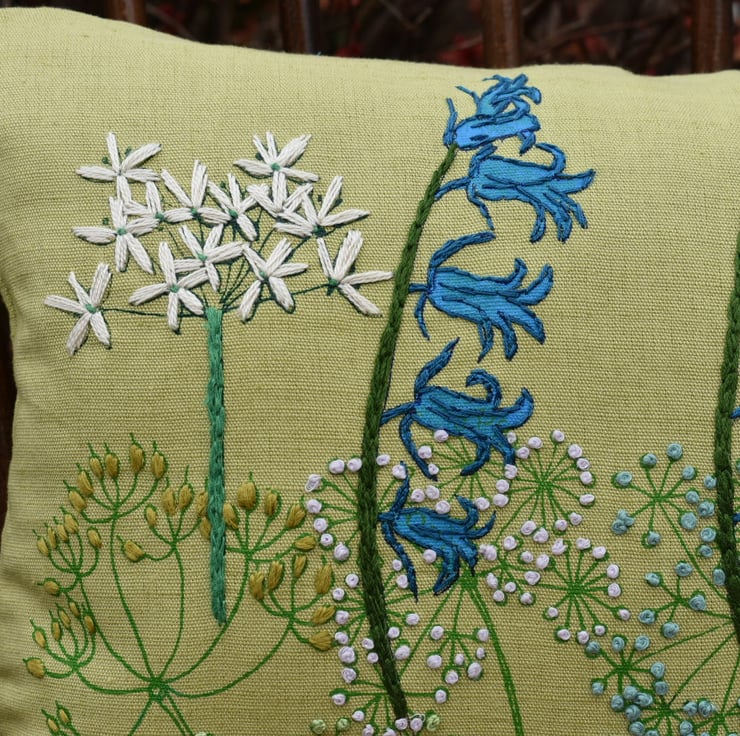 This is a green medium weight linen cushion that has been screen printed with my own designs. There are cow parsley prints to the base of the pattern, these have their flowers hand embroidered. There are 2 bluebells and 2 wild garlic that have been screen printed and also hand embroidered.
