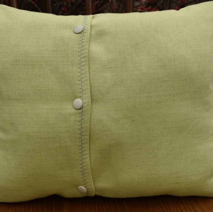 The reverse of the cushion is green to match the front, with some decorative green machine stitching. The cushion is an envelope style with 3 poppers to stop any gaping.