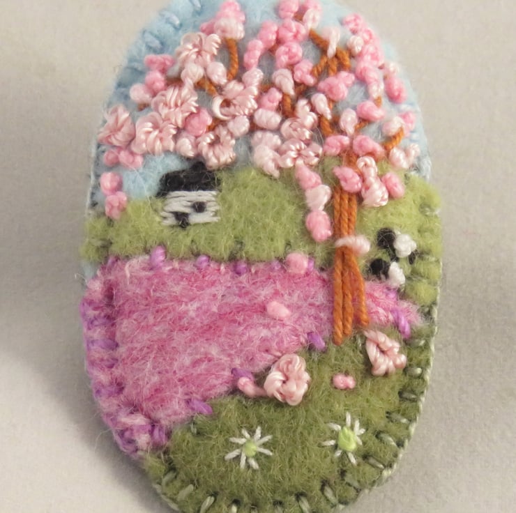 The background of the brooch has been created from felt. The tree has been stitched in cotton threads using simple embroidery stitches and the blossom has been represented by a cloud of french knots in shades of pink thread - one of which is a vintage thread with a lovely sheen. Tiny sheep, daisies and a little white cottage complate the design.
