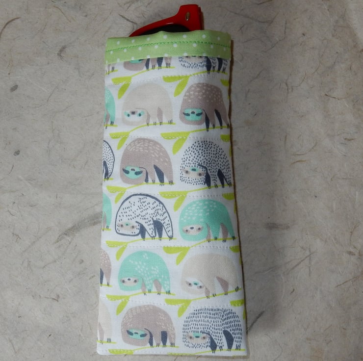 Sloths are popular at the moment and this glasses case features some very cute ones. It is made from a cotton print fabric with a layer of wadding for protection and a contrast green and white spot trim and lining. This is a slip in style glasses case, if you require a case which fastens please view my other listings.