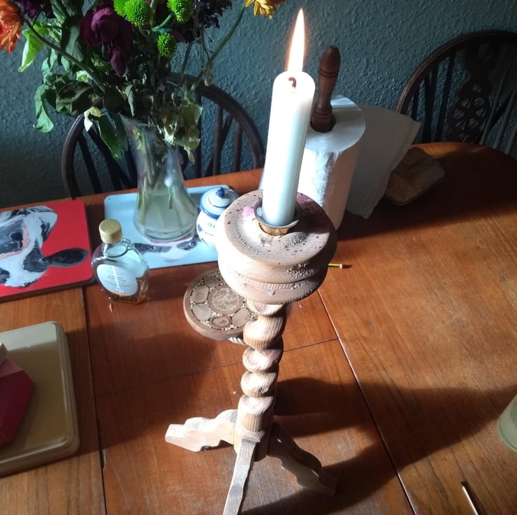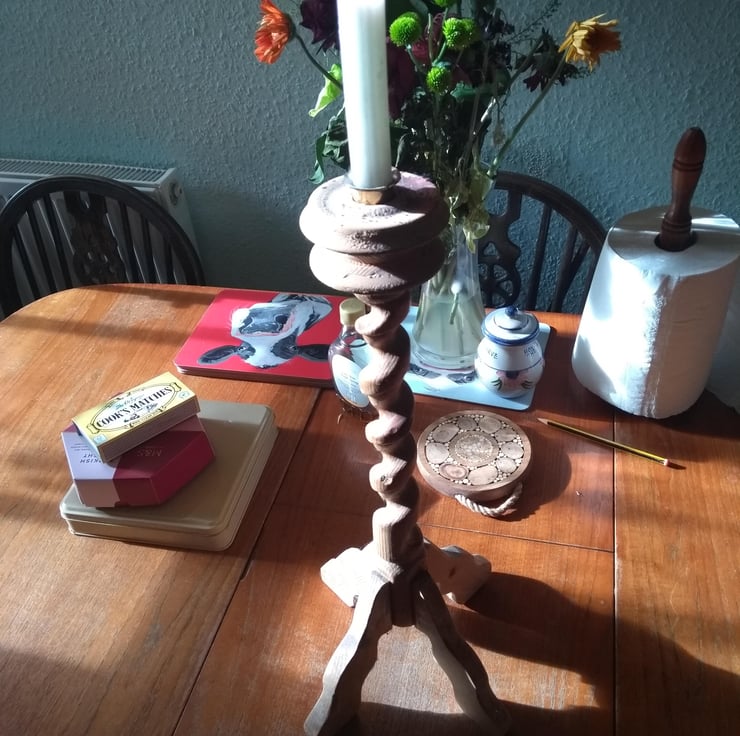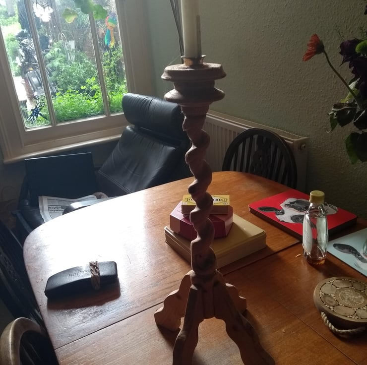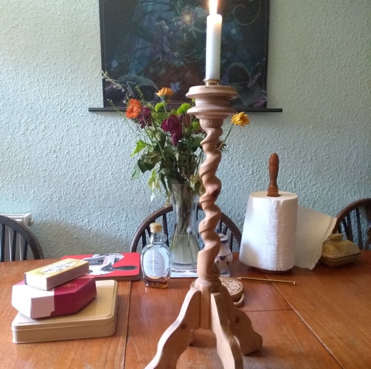 years ago I made a hand cut spiral, it took ages...using a tenon saw, then files and sandpaper and eventually it became a candle stick holder. We have used it over the years and now I am offering it to a new owner....