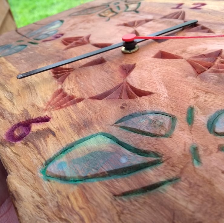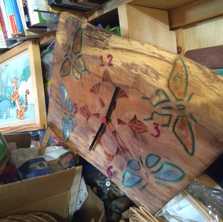 years ago my mum gave me a eucalyptus tree sapling, which I planted and it grew quickly into a mature tree. which unfortunately blew down in 2012, so after it was logged in August 2016 a decided to make a clock out of it. My youngest daughter loved it and hung it in her room for years. Now she has moved out I am offering it to a new owner...(it is hanging on my shed gathering dust as it tells the time ATM)