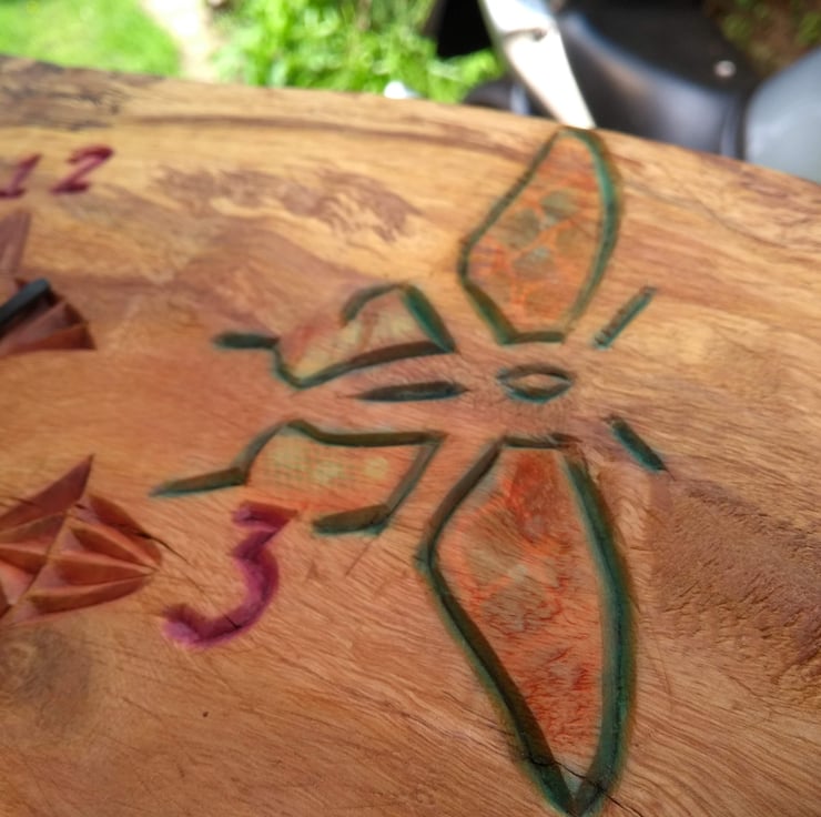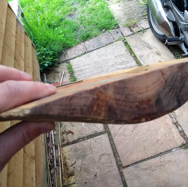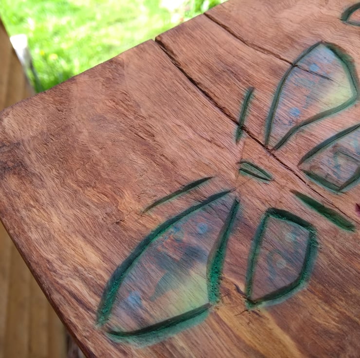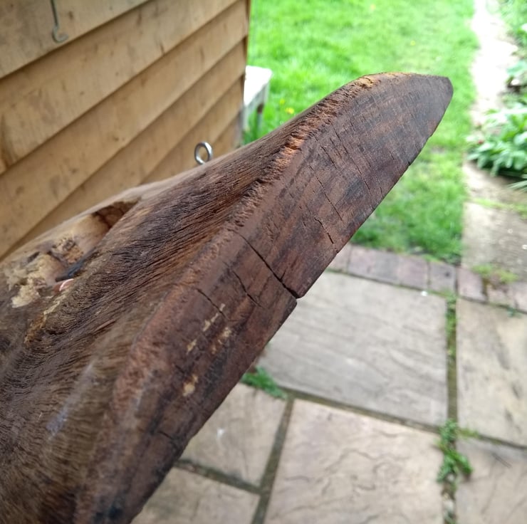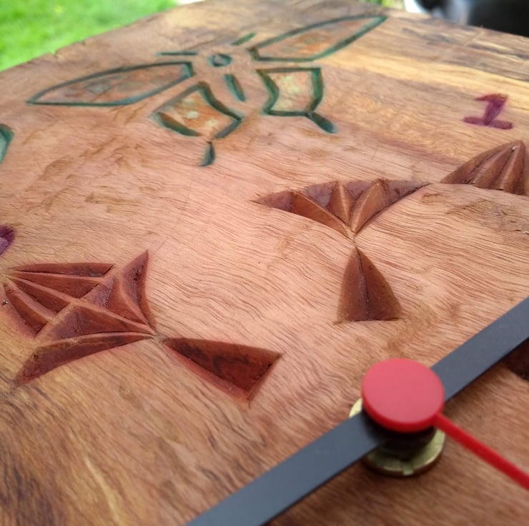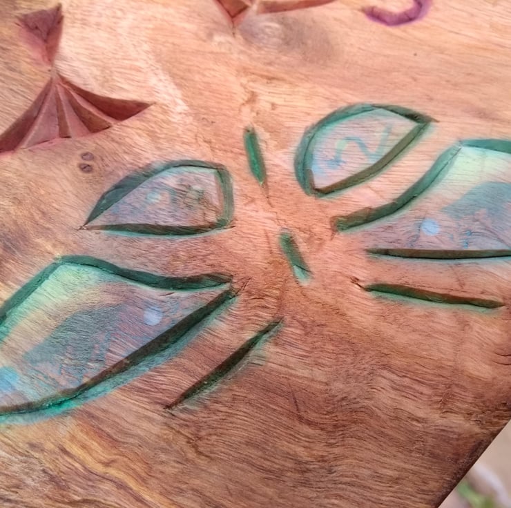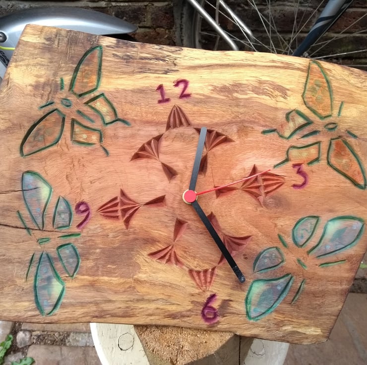 I was looking at chip carving at the time, so really enjoyed carving the butterfly shapes, which came from a stencil pack. then a touch of acrylic paing... The grain of the wood is stunning...I just love the shakes and cracks, the small holes...mother nature at her best note, it hangs slightly off centre, due to the shape of the tree trunk and the hook ( as usually happens, you have to follow the wood grain)