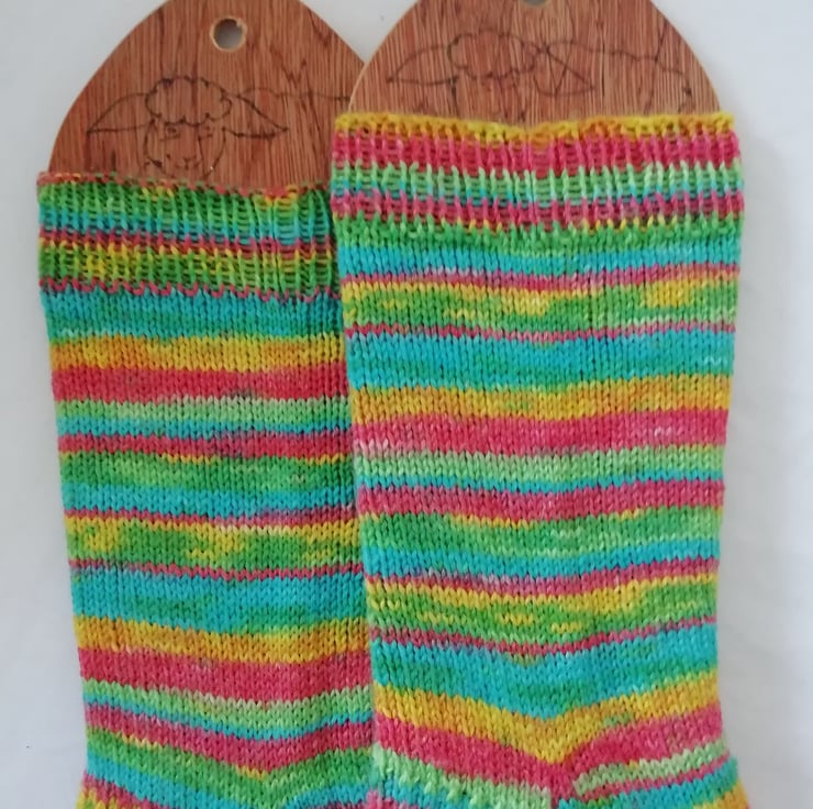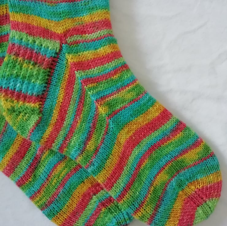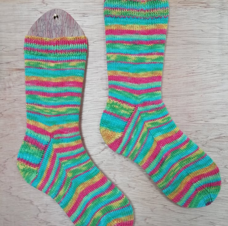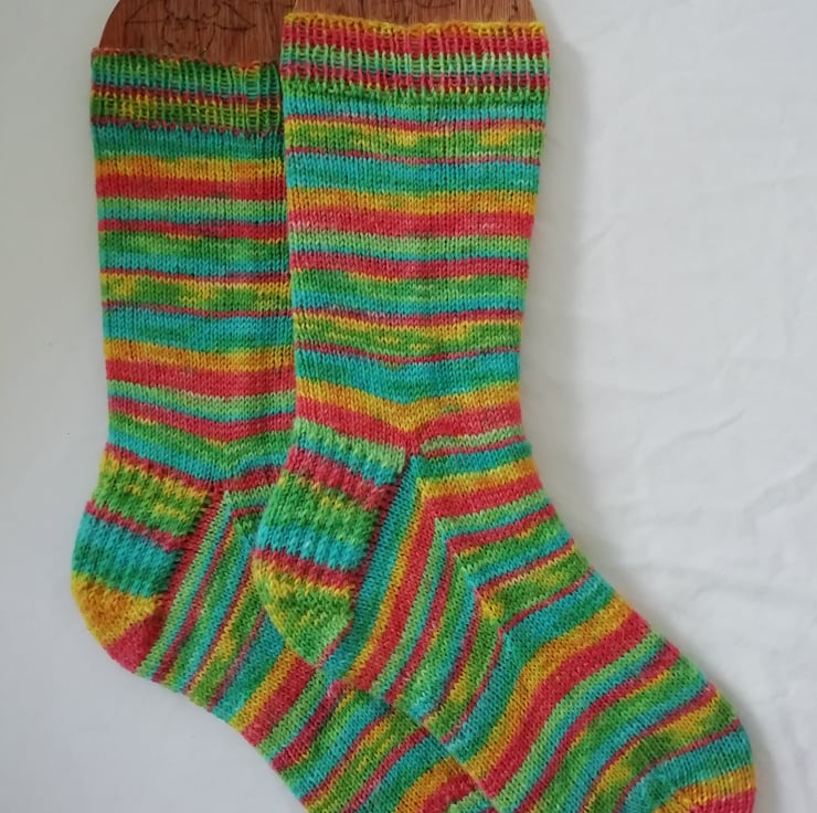 These socks are hand knitted using traditional methods on five double pointed needles. They are made using a durable and comfortable 4 ply yarn comprising of 75% wool and 25% nylon, which helps to give the socks strength. This is a good quality sock yarn by Opal, and is part of their Rainforest inspired colour range, with the colours in this pair inspired by Parrots.