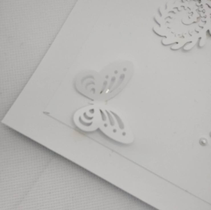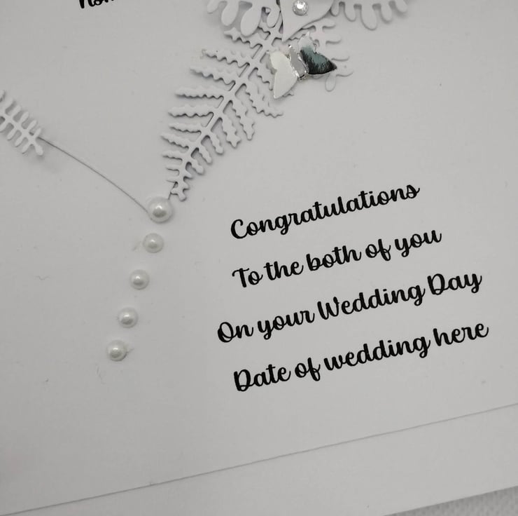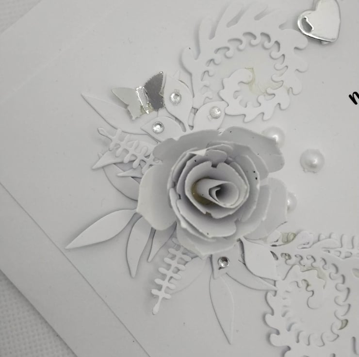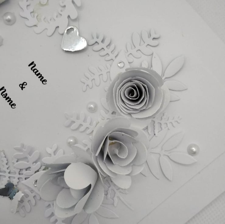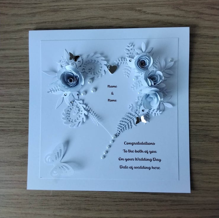 Unique, handmade, personalized 8" x 8" square card, 300gsm card base, with presentation box. This card features a floral Heart, created with handmade 3d paper White Rose's one on the upper left of the Heart, 3 on the right upper side of the heart , these are with various paper foliage, embellished with high quality, faux white Pearl's, petite crystal diamantes, delicate, foiled paper butterflies and a Heart. Personalized free of charge (occasion, recipient, number's/age ) please contact me before placing your order to discuss these requirements, please check spelling/punctuation, many thanks Karen