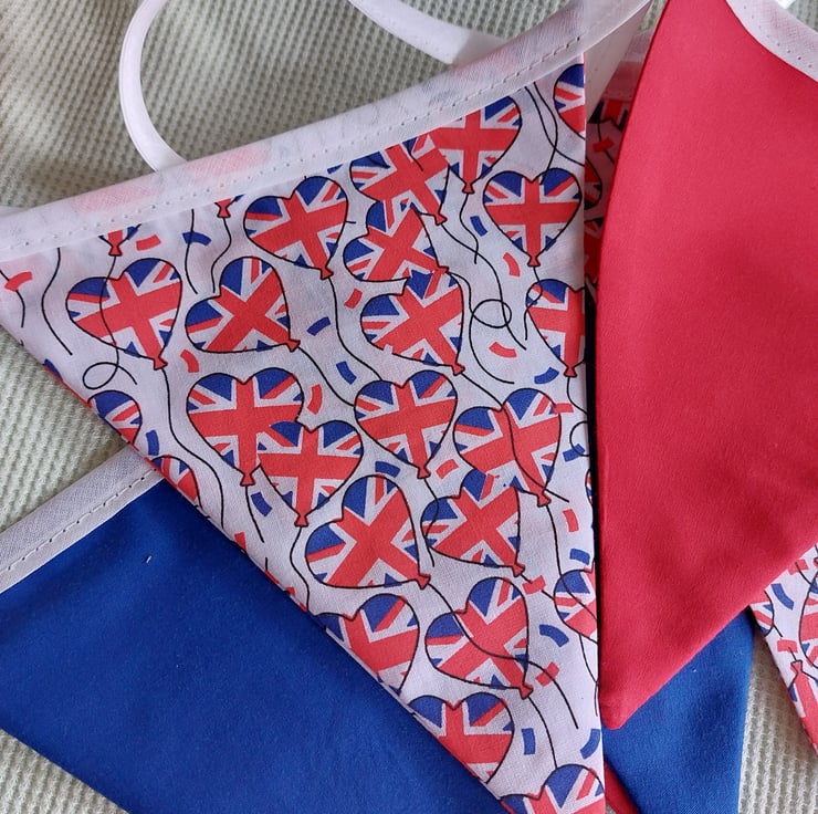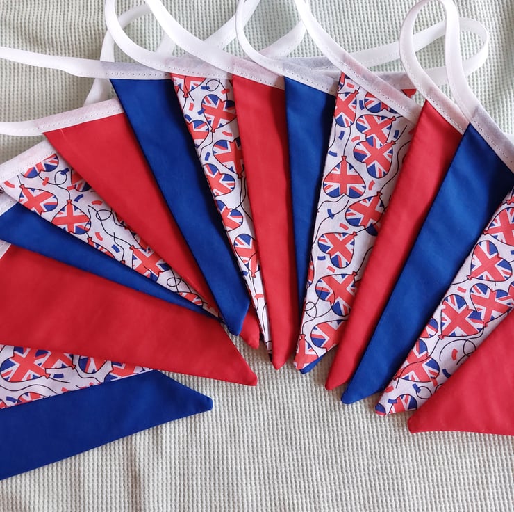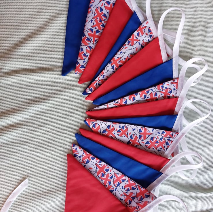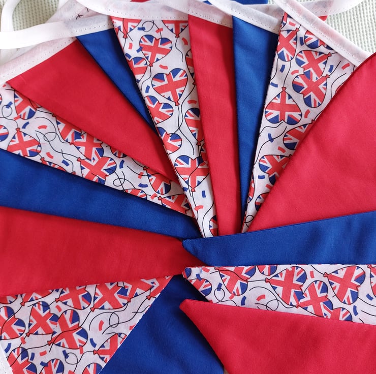 5 metres of Handmade double-sided bunting, incorporating 15 polycotton fabric flags measuring 20x16cm stitched to a white bias tape with 30cm extra tape either end for tying.