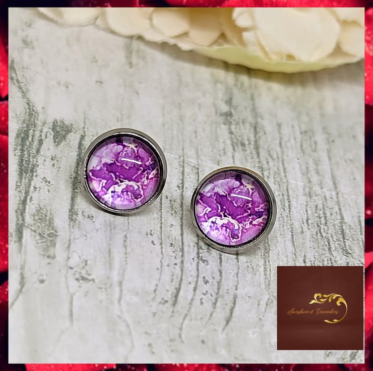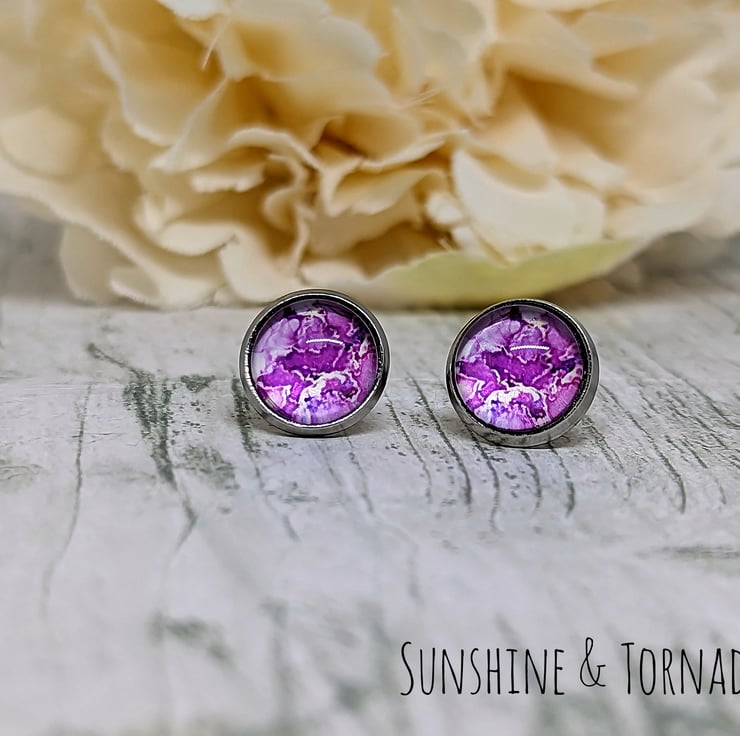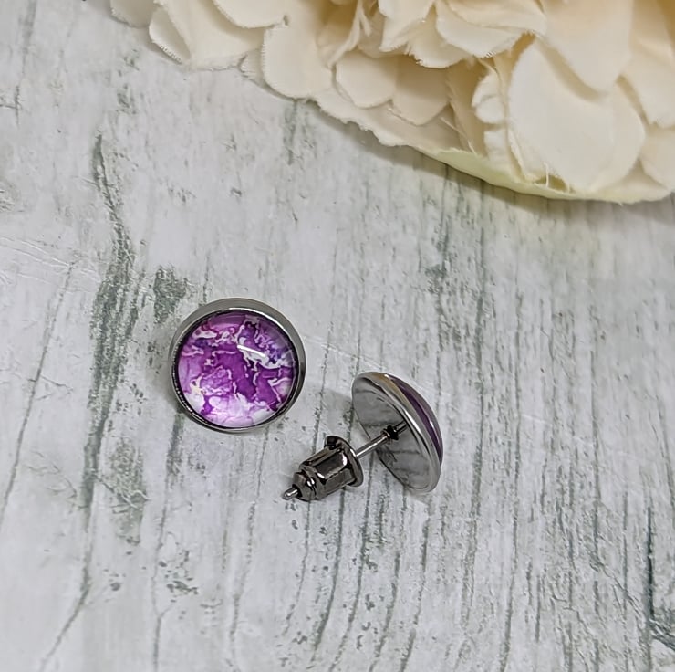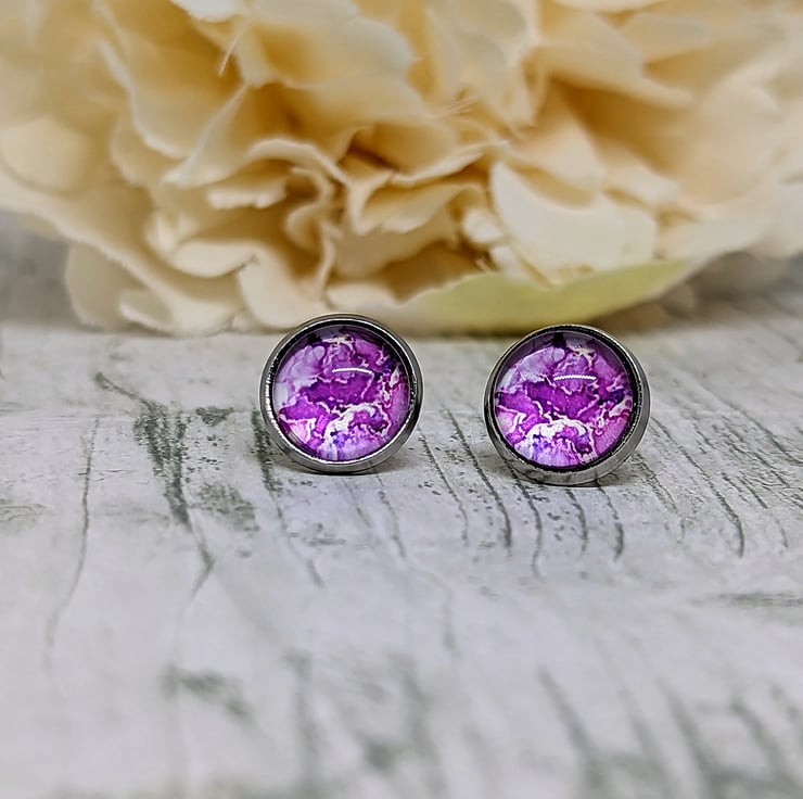 These beautiful stud earrings are made using marbled paper, set under clear glass domes and mounted in non-tarnish allergy friendly Stainless Steel Bezels, with bullet backs.