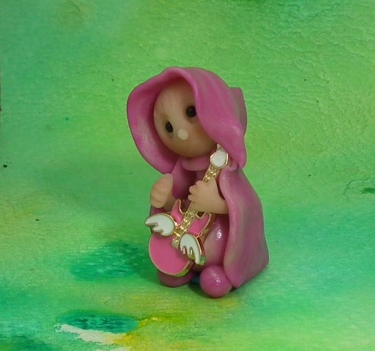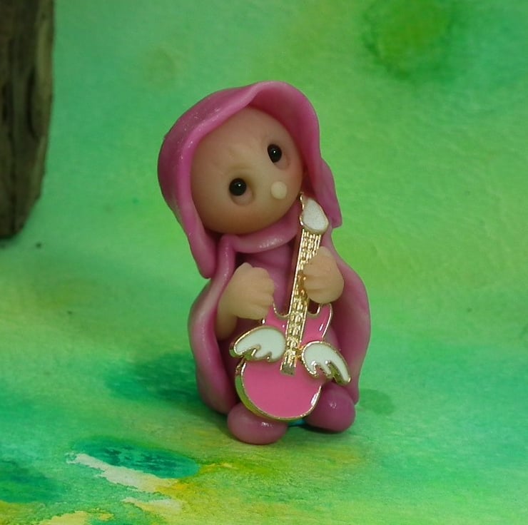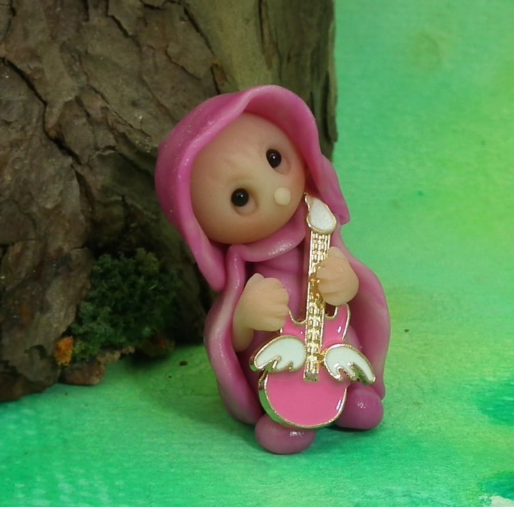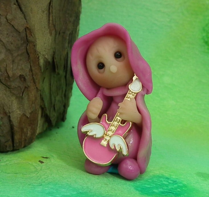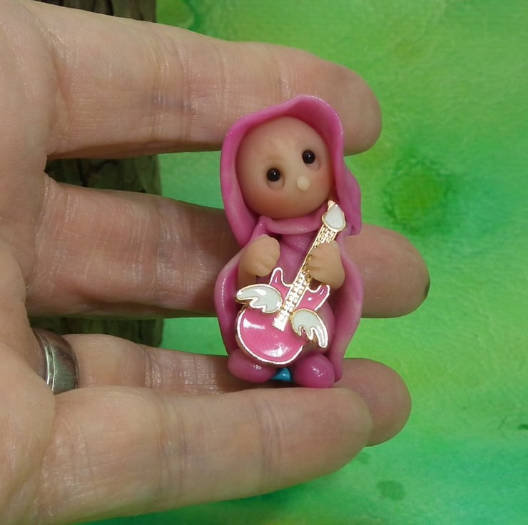 This is a 'one of a kind' creation having been entirely handmade without the use of moulds here at my studio on the Sussex Coast. Modelled with Prosculpt polymers, painted with heat set paints before sealing with lacquer, Monica has sparkling black onyx eyes and a pink metal guitar. She is just one and a half inches tall and has been instructed not to make any noise in transit ...
