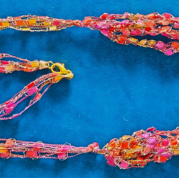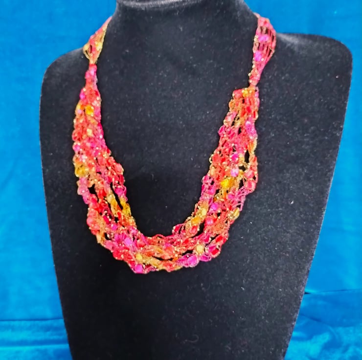 This lightweight, soft, handmade crocheted necklace is made from 5 strands of multi coloured ribbon yarn that are joined together and fasten with a lobster clasp.