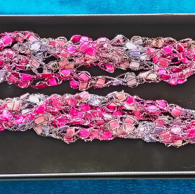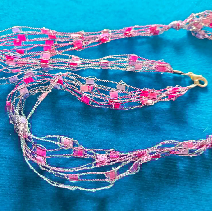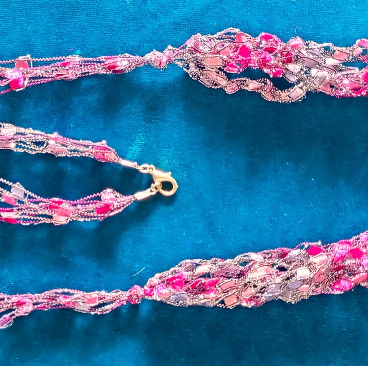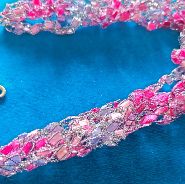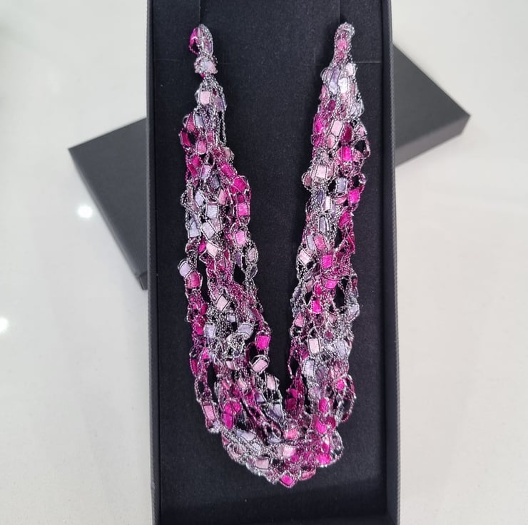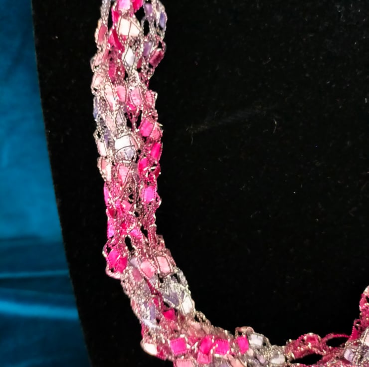 This lightweight, soft, handmade crocheted necklace is made from 5 strands of multi coloured ribbon yarn that are joined together and fasten with a lobster clasp.