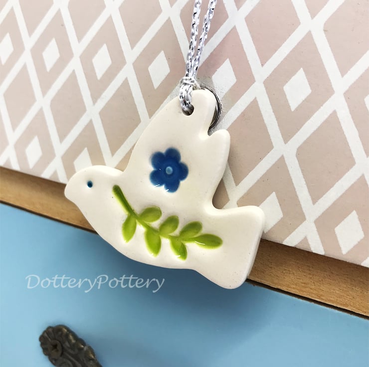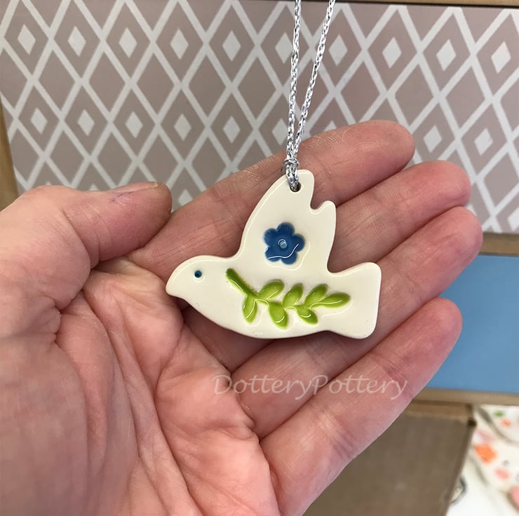 This little ceramic dove decoration is made from white earthenware clay and finished with leaves and a flower This has been fired in an electric pottery kiln, so it is nice and strong. It measures 4.5cm x 4cm and hangs from a silver string. It is glazed on the front and left plain on the back.