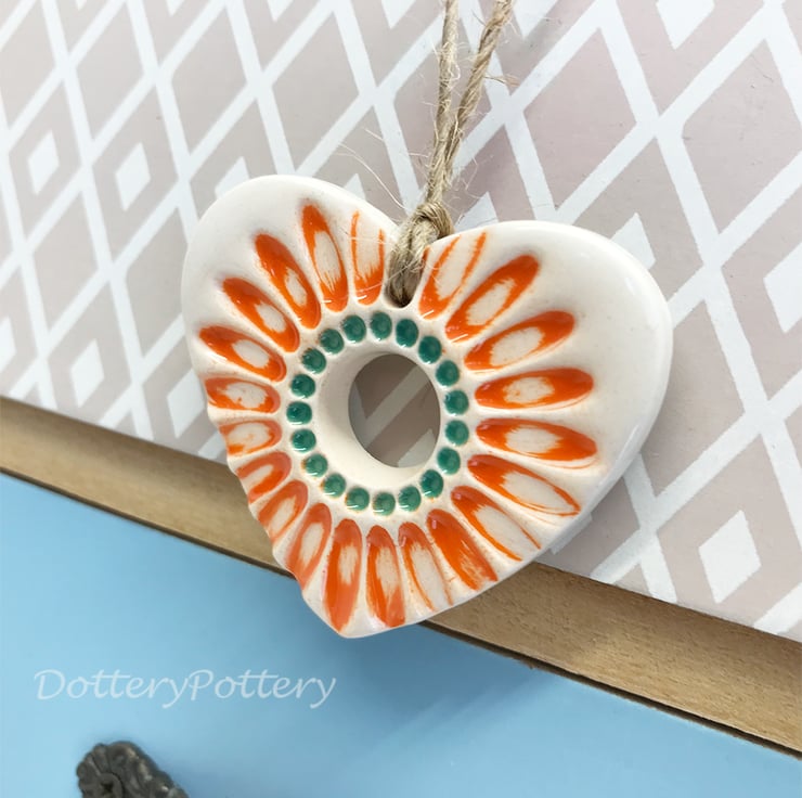 This little heart is made from white earthenware clay and imprinted with a daisy design. It has been fired twice, once to the bisque stage and then a second firing for the clear glaze. It measures 4.5 centimetres wide x 4.5cm height x 5mm thick.