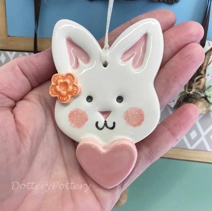 This little Easter bunny is made from white earthenware clay. This has been fired in an electric pottery kiln, so it is nice and strong. It measures 6cm x 9cm and hangs from a matching cream organza ribbon. It is glazed on the front and left plain on the back.