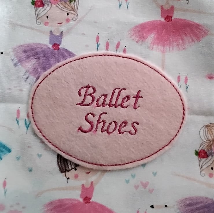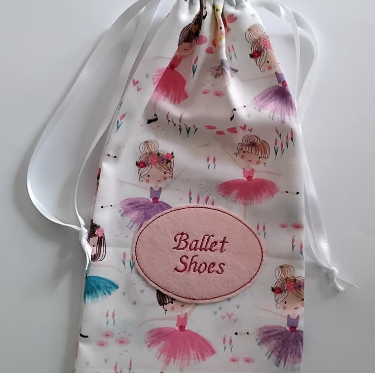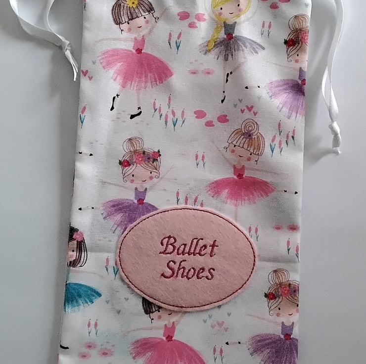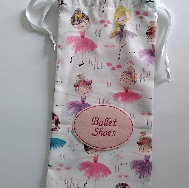 This lovely ballet shoe storage bag in a ballerina print cotton fabric. With a draw string ribbon to give easy access and at approx 10inch x5inch it's a perfect size for budding ballerina to carry into dance class