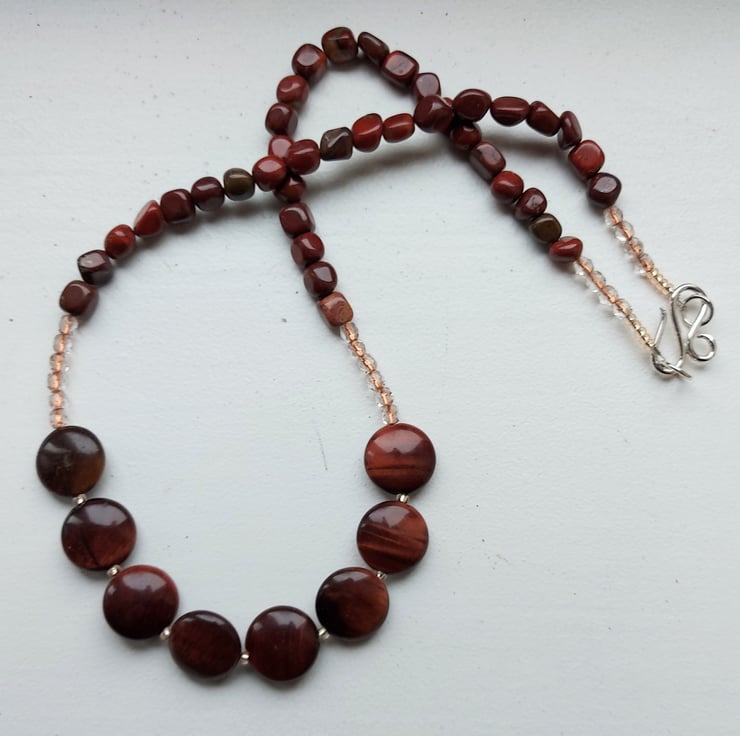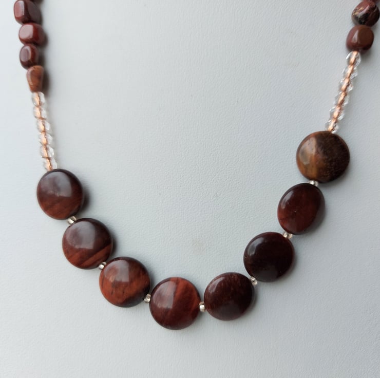 This lovely gemstone and crystal bracelet features large round beads of reddish-gold tiger's eye in a puffed coin shape, 1.5cm in diameter. These alternate with 4mm faceted Czech crystal beads, sparkling clear but lined with copper to complement the red-bronze colour scheme.