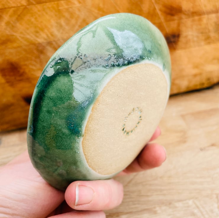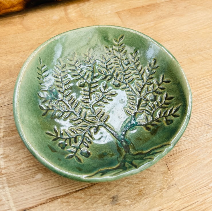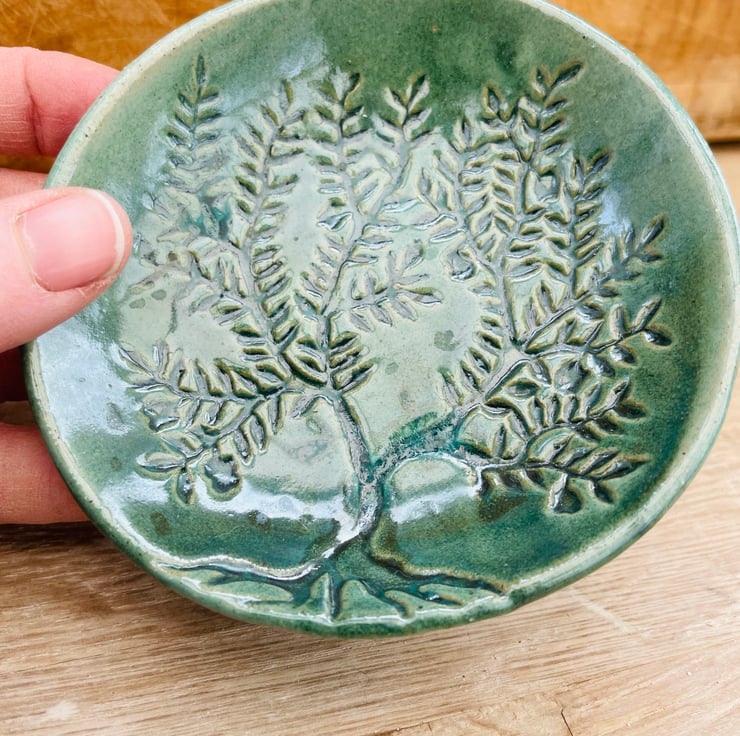 Hand made slab built ceramic dish in strong stoneware, impressed by the tree of life woodblock and fired to 1240 degrees with a gorgeous metallic green combination of glazes, it is 10.5cm in diameter.