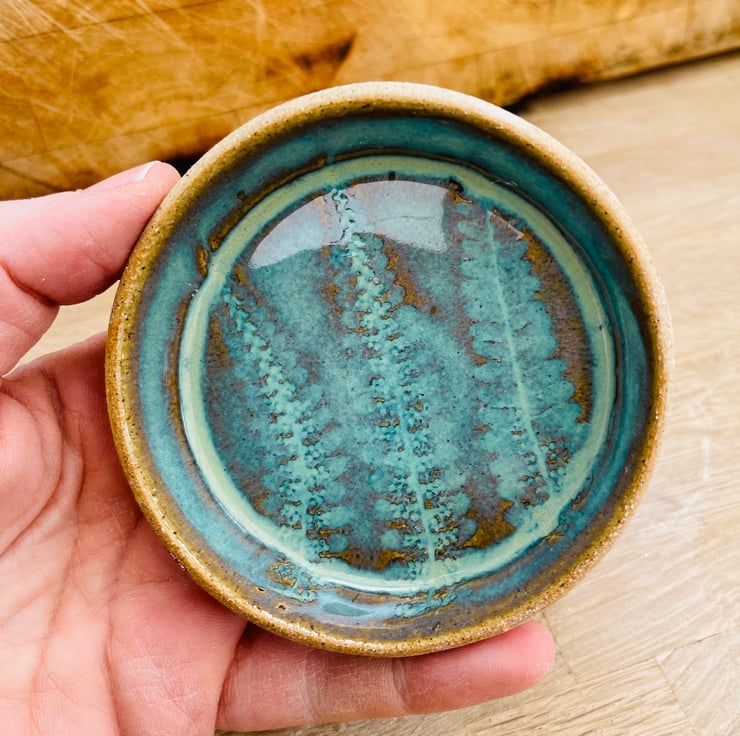Hand made wheel thrown ceramic dish in strong stoneware, impressed with fern leaves and fired to 1240 degrees with a gorgeous green combination of glazes, it is 9cm in diameter.