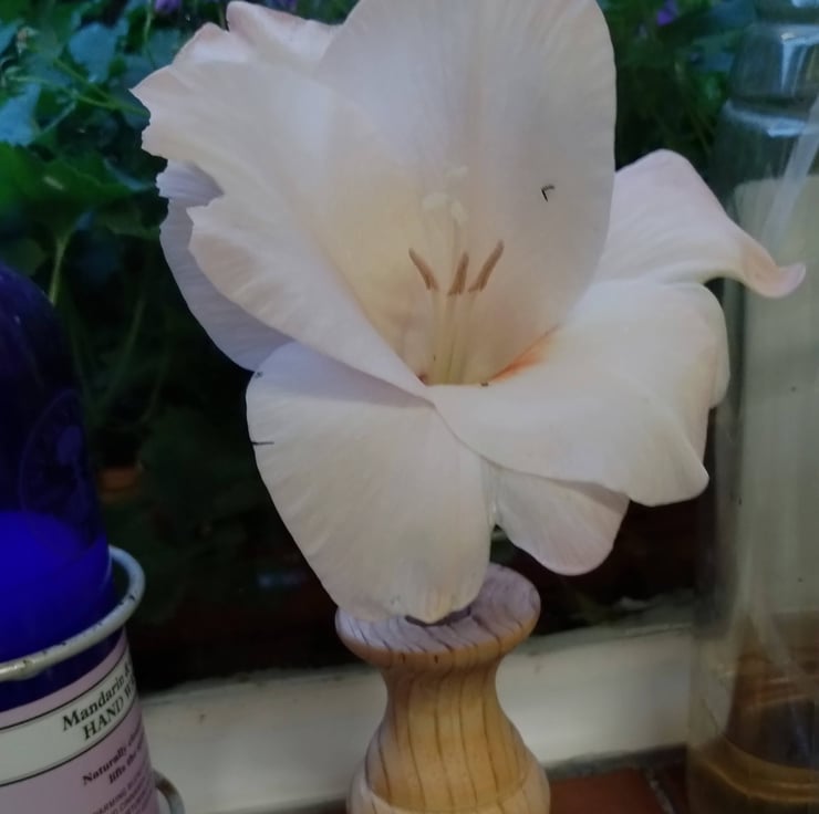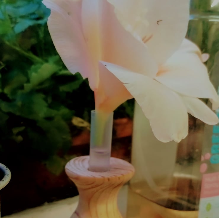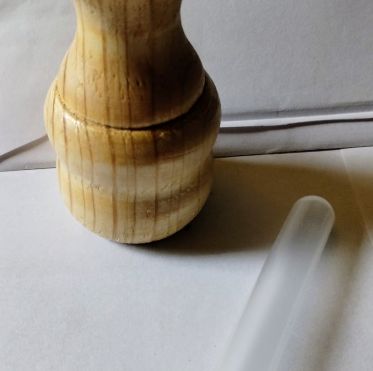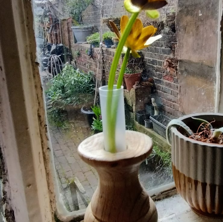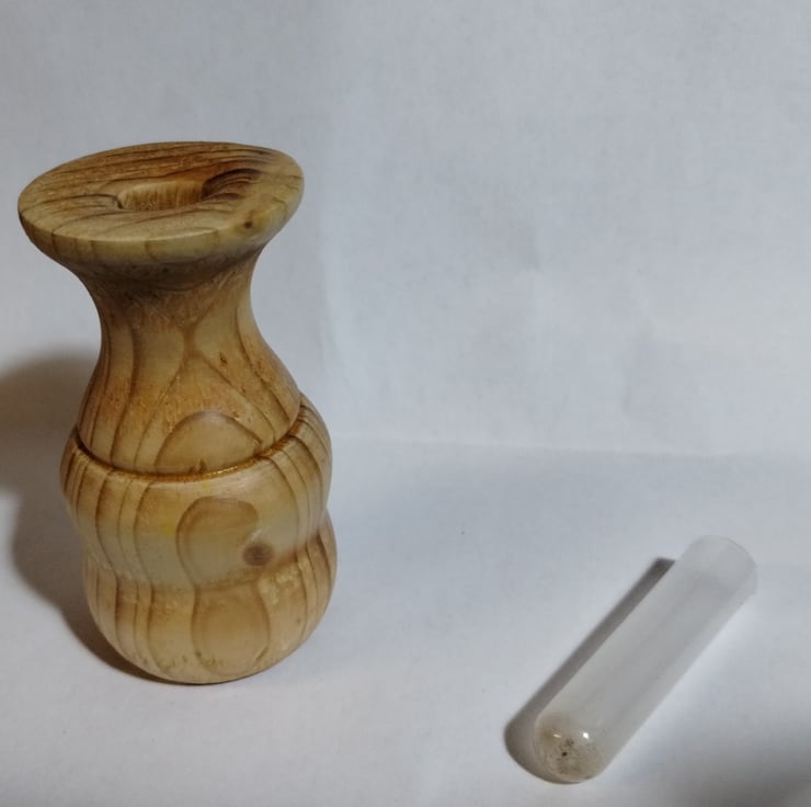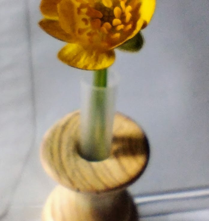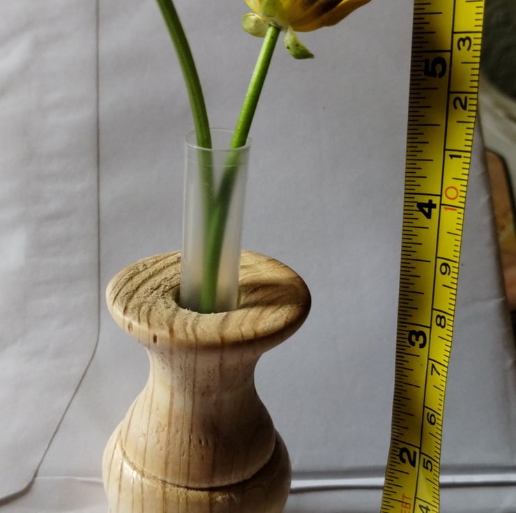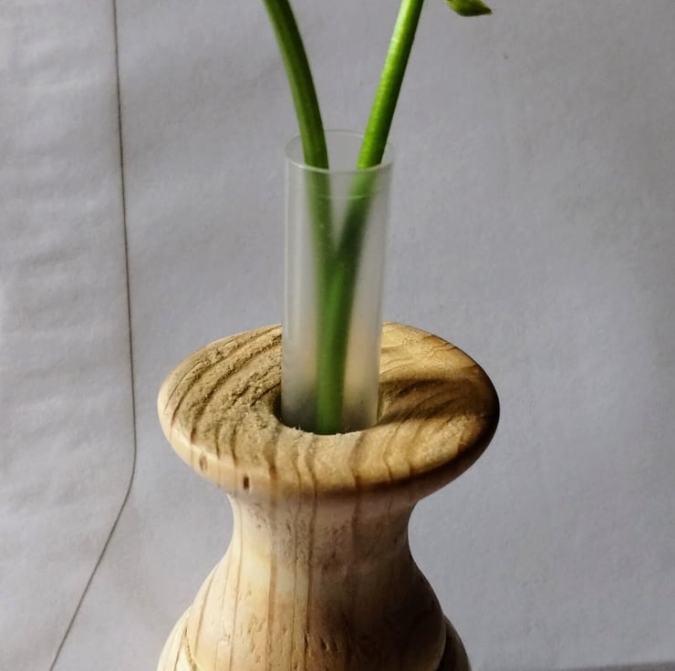 a small wooden vase with a plastic test tube insert to hold some water for a bud vase / flower vase.... very small, made from pine, so a bit rough in places as the grain pulls, finished in acrylic lacquer, has some nice wood grain.