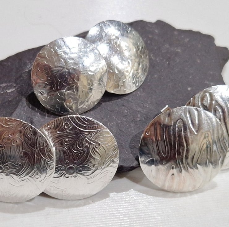 This is a collection of handmade sterling silver disc earrings, available in sizes from 13mm diameter to 25mm, different textures, either domed, hollowed or flat.