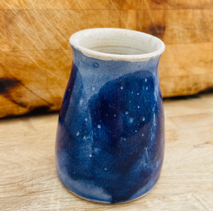 Hand thrown on the pottery wheel in strong buff stoneware clay and finished with a shiny vintage white glaze to the inside and a swirly royal blue outer.