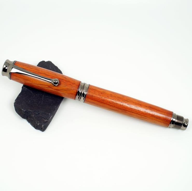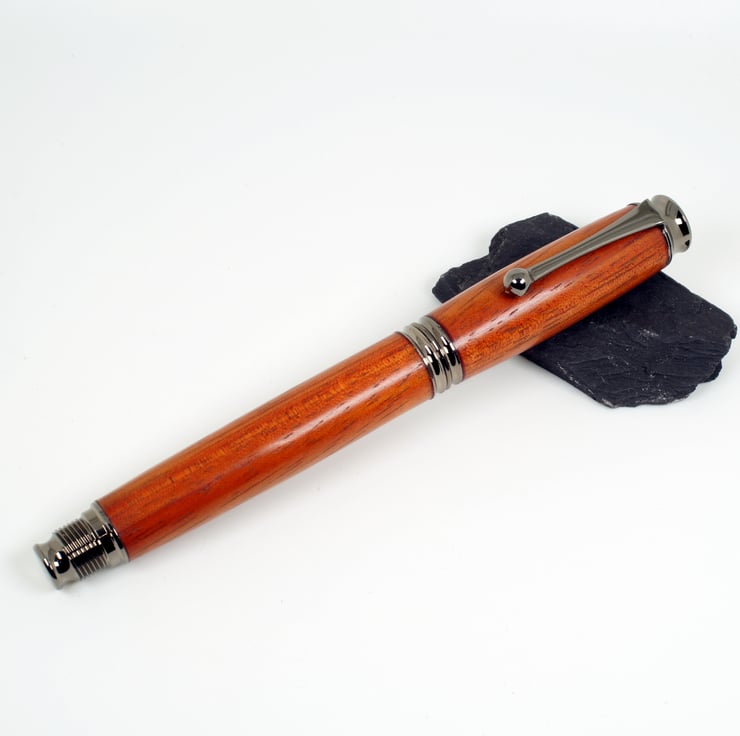 This pen was hand turned by me in my workshop in Bures, Suffolk, the metal parts are dark chrome gunmetal finish, Included in the price is a black card presentation box