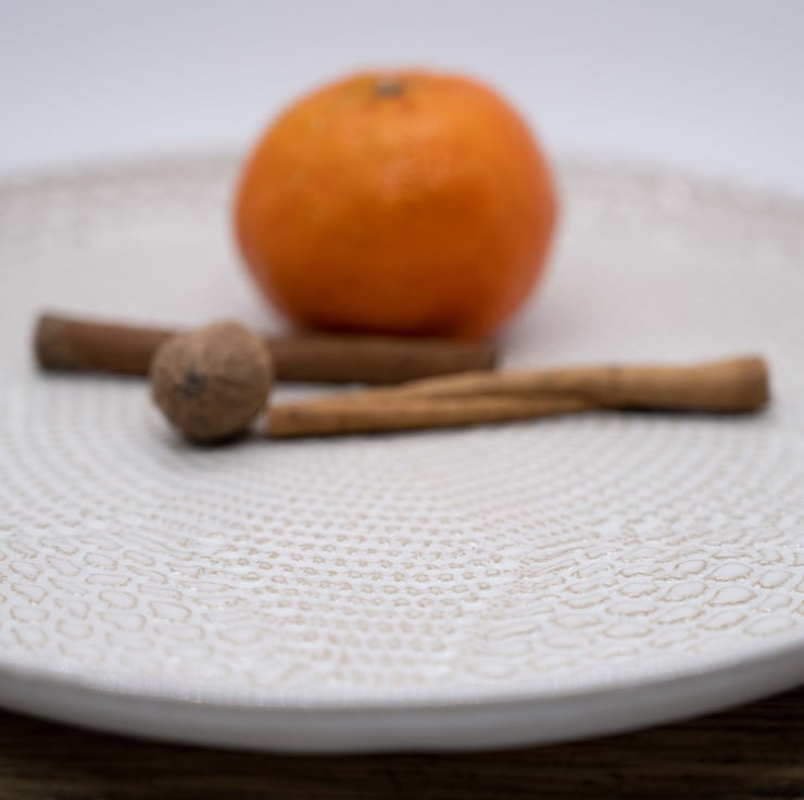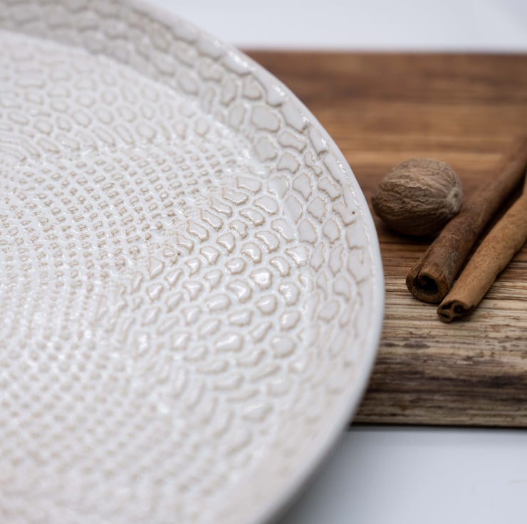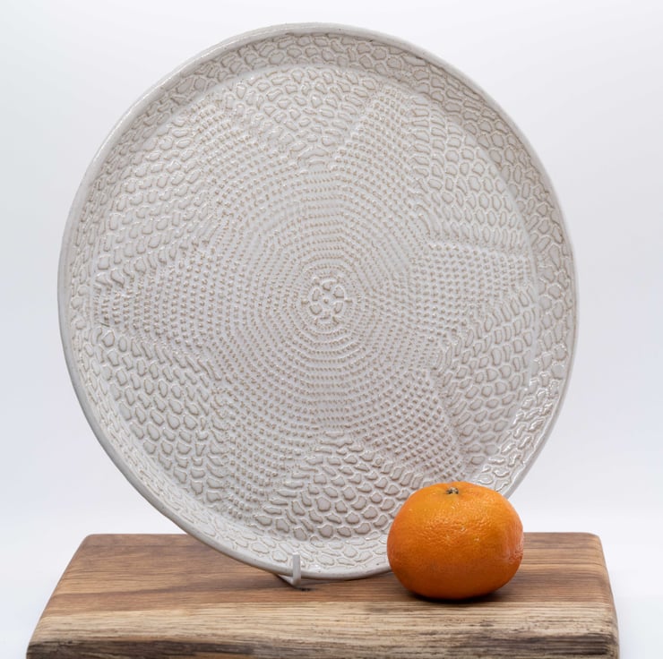 Hand made slab built ceramic dish in strong white stoneware, impressed with a beautiful lace star and fired to 1240 degrees with a vintage white glaze, it is 25cm in diameter and has been finished with a handmade foot ring.
