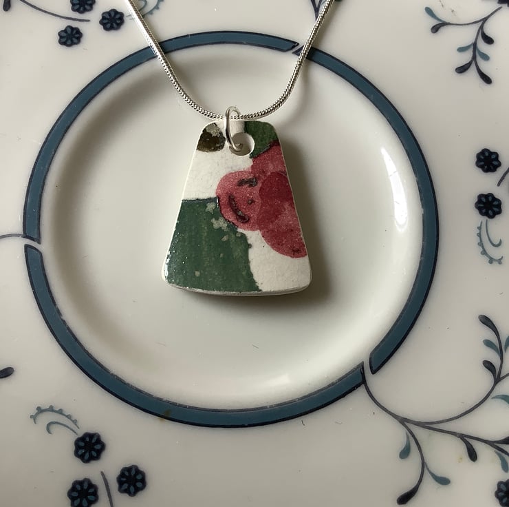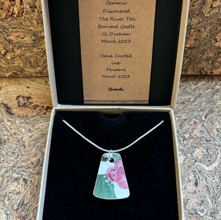 Hand crafted Jewellery and framed artworks using pre loved and discarded ceramics. Ceramic material will show signs of wear and damage. Entire process is a creative experience from discovery to final picture, nothing planned or preconceived. All materials personally collected from river banks, charity shops, roadside, woods, recycle centres, beaches, wherever dropped, dumped or donated ceramics are found, cleaned and shaped into new stories. Each piece comes with a short bio of where the ceramic came from, date found and re-created. Some shards collected are used as found, others are cut randomly which shape the final work. Every piece is individual, nothing replicated, however, due to repetitive patterns in ceramics there will be some similarity but only through the ceramic material not in the final piece.