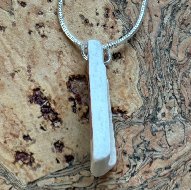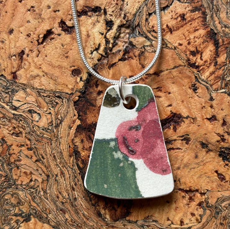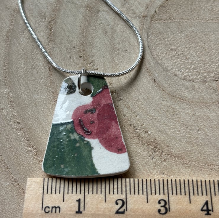 After a particular heavy downpour I walked a small area known as the ‘beach’, sand covered right beside the river with amazing trees growing out of the bank, roots exposed and twisted. Here I notice sticking out of the sand a piece of ceramic, green, white and a pinky red circle shape. Looked so lovely I took a photo of it, when I lifted the shard I saw immediately I could make it into a pendant. The shape was already pendant perfect just needed a hole and some sanding. Front and back glaze in tact, sides smoothed and sealed with eco friendly non toxic matt sealant. Where I drilled the hole, the back is sanded and sealed to stabilise the area.