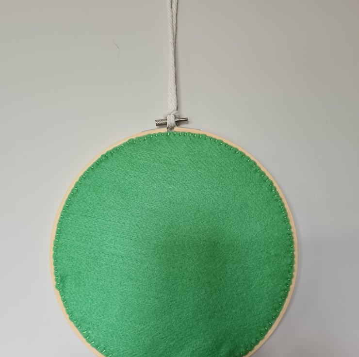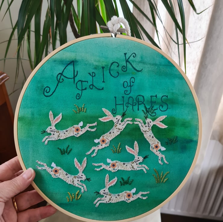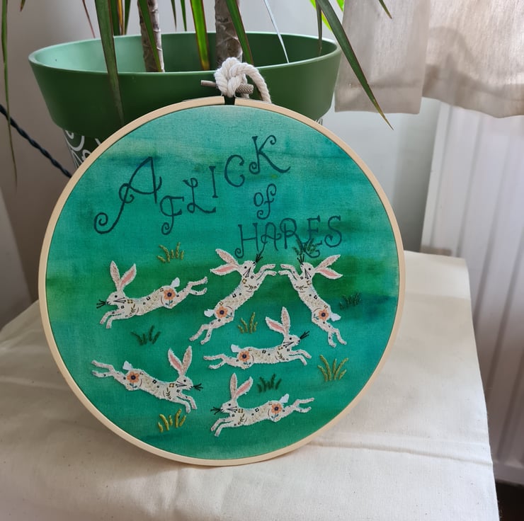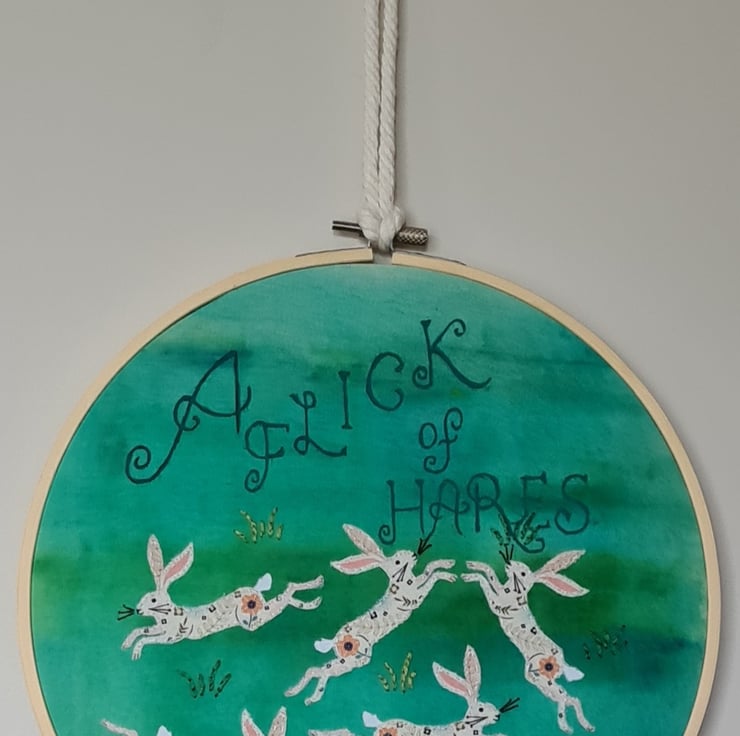 A Flick of Hares is on a lovely green hand painted calico background. The hares have been hand cut and stitched. The caption is hand written in acrylic paint pens and the back has been finished with green felt and hand sewn with matching embroidery thread. This 9" hoop can be hung straight on a nail or from a cord. This is a unique piece of work but a similar piece can be made to order.